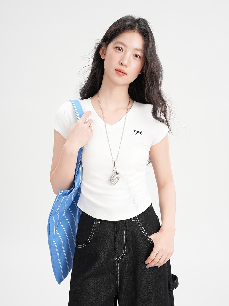 2025夏新作入荷 Vネック トップス Tシャツ 半袖リボンデザイン 正肩Tシャツ レディース 2025夏 辣妹 プリーツシェイプ ショートトップス