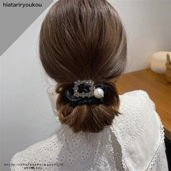 ラインストーンスクエアメタルとビッグビーズのつやつやシュシュ 大人 かわいい プレゼント ヘアアレンジ レディース 軽い プチプラ ポイント消化 おしゃれ