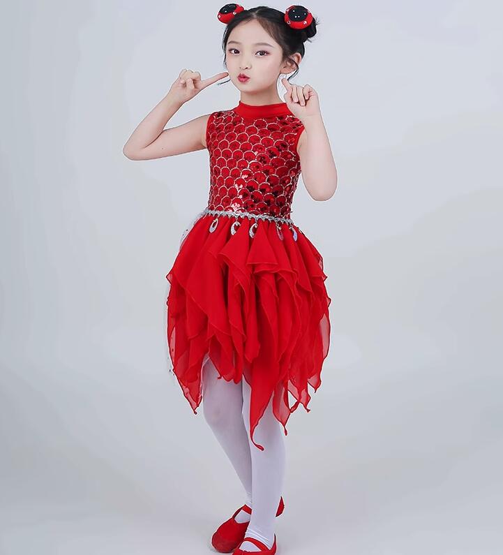 バレエダンス衣装 子供ワンピース 女の子モダン社交ダンスウェア ラテンダンス レイヤード レッド タンゴワルツダンス衣装 レッスン練習 舞台DS演出服 女の子ステージ演出衣装 舞台団体服 ダンスウェア