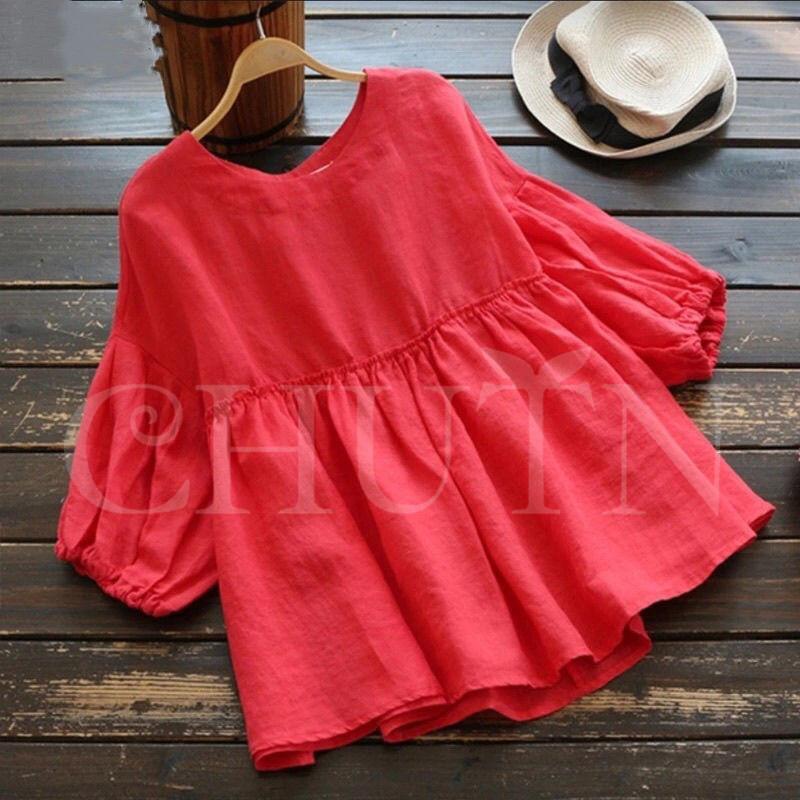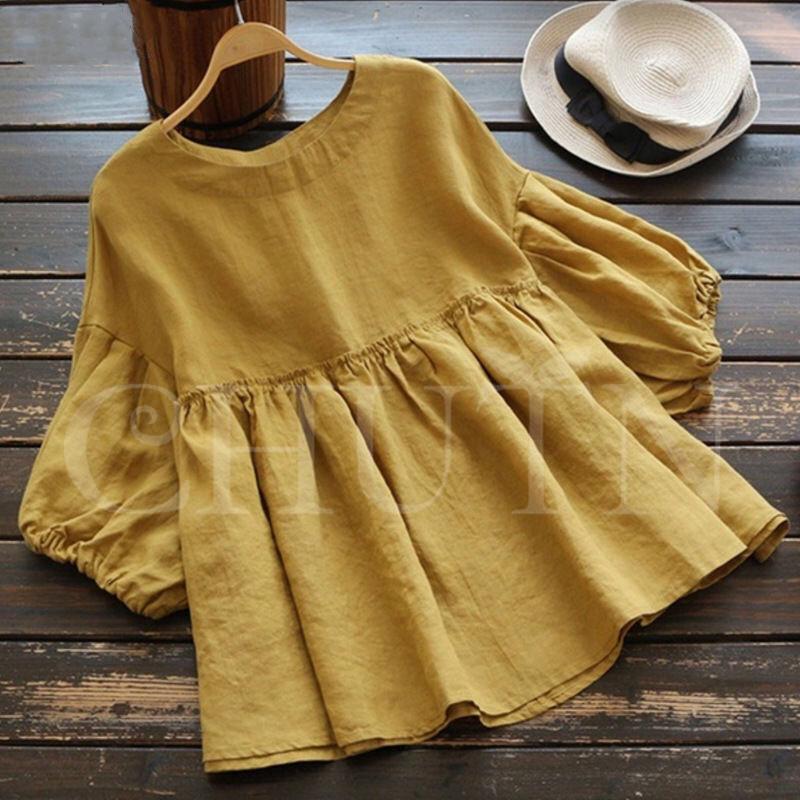 ブラウス レディース バルーンスリーブフレアブラウス 半袖 ギャザー ペプラム トップス 新作 トレンド 夏 プルオーバー 綿麻風 袖ゴム 無地 フリル カジュアル お洒落 可愛い