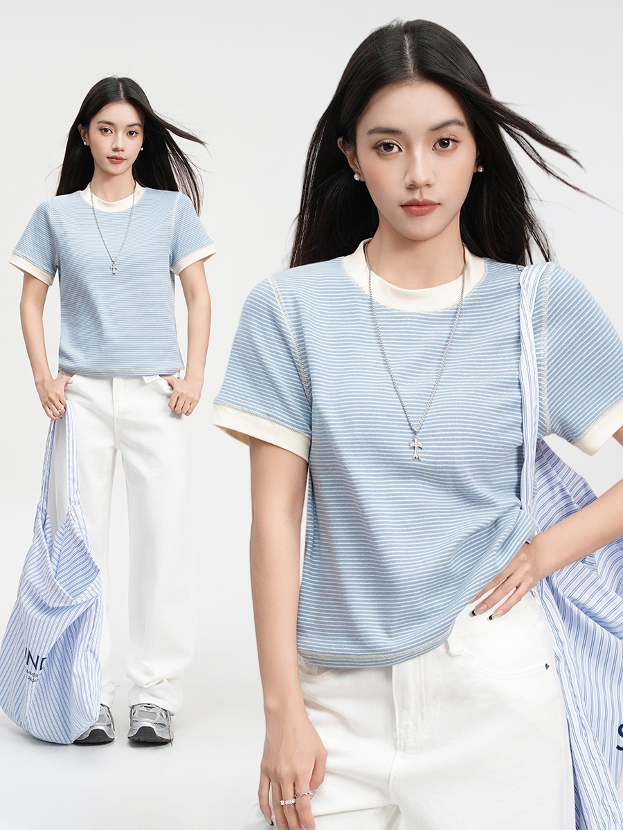 2025夏新作入荷 カラーブロックストライプ クルーネック半袖 Tシャツ レディース トップス Tシャツ 半袖 ボディコン 着痩せ デイリー/リゾートコーデ