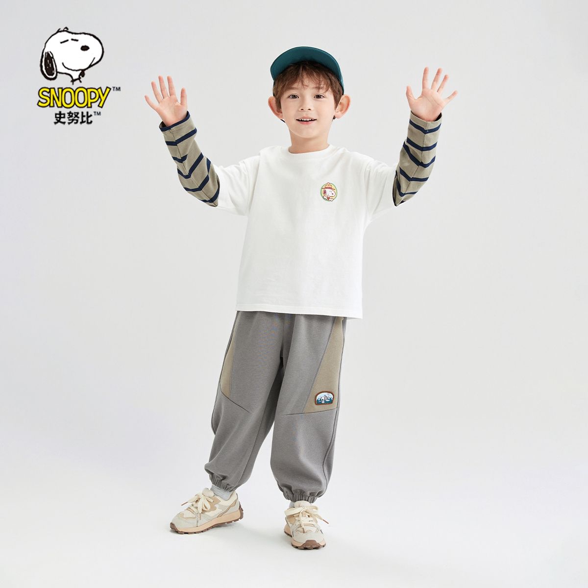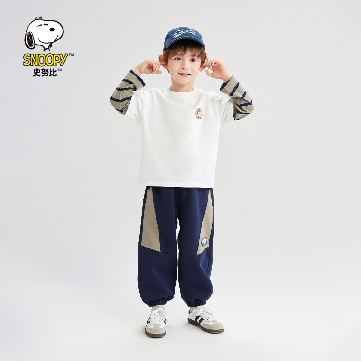 スヌーピー児童長袖tシャツセット2025春の新型男児偽2枚のシャツのズボン2枚セット