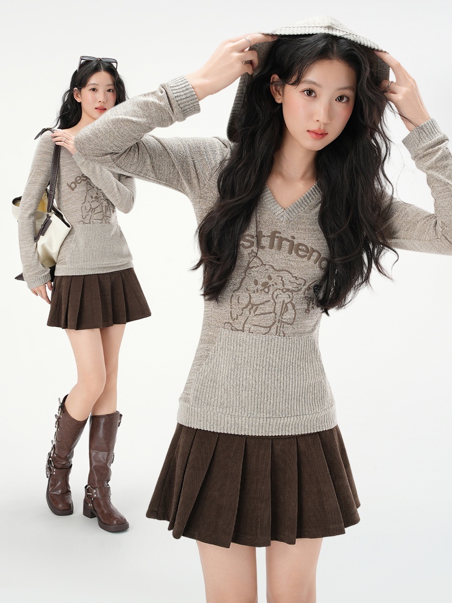 2025新作入荷 春/秋 韓国風 長袖 トップス パーカー 無地 プリントフード付きVネックニット レディース スリムフィット シルク風肌触り