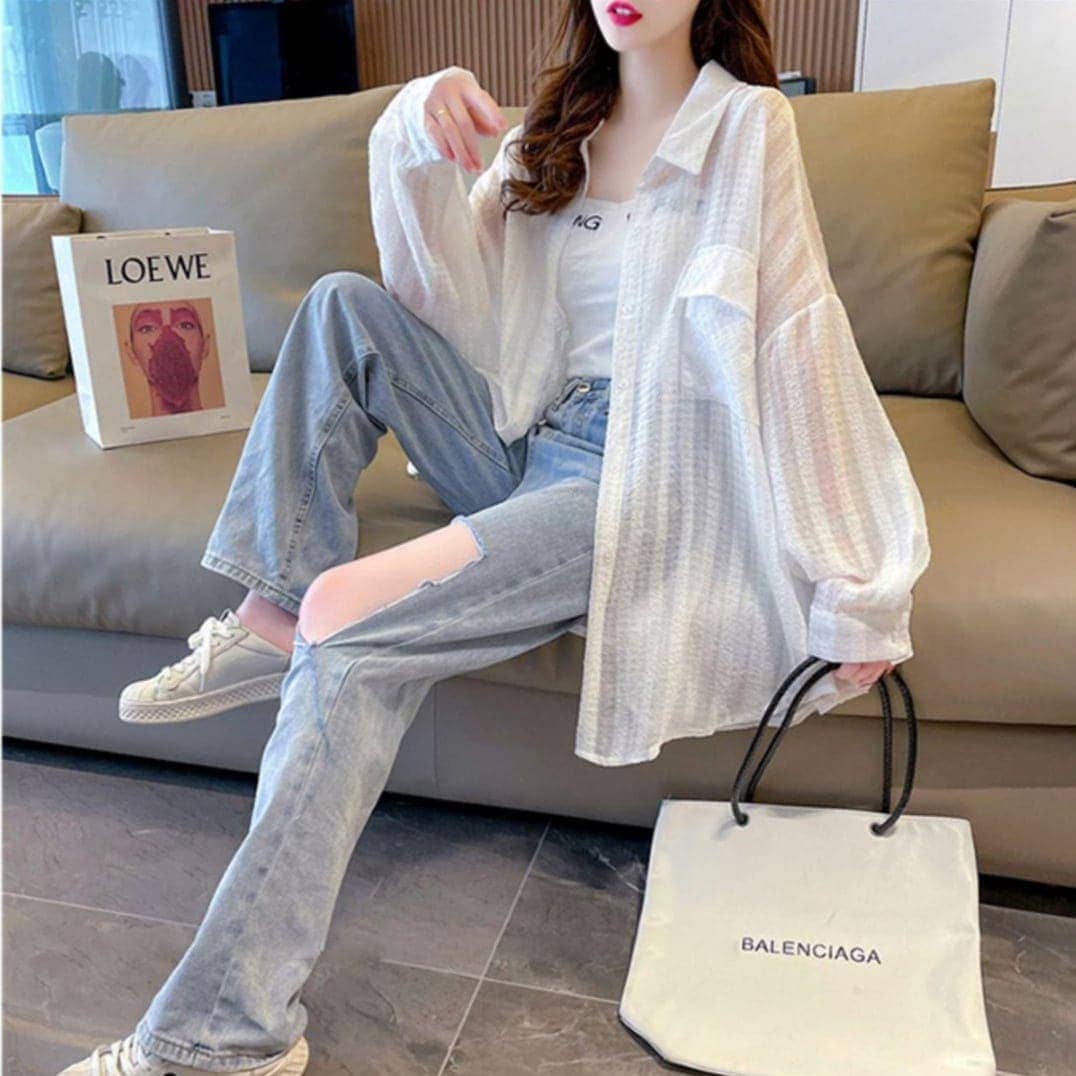 ストライプサンブレーカーシャツ女性2025夏モデルデザインセンス緩い中長袖薄手ジャケット