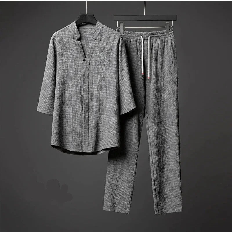 【2点購入で1OO円オフ】[即納]涼しい ゆったり 部屋着 ルームウェア 父日 ひんやり カジュアル ロング丈 パンツ ロングパンツ 綿麻 tシャツ 接触冷感 上下セット 夏 メンズ セットアップ