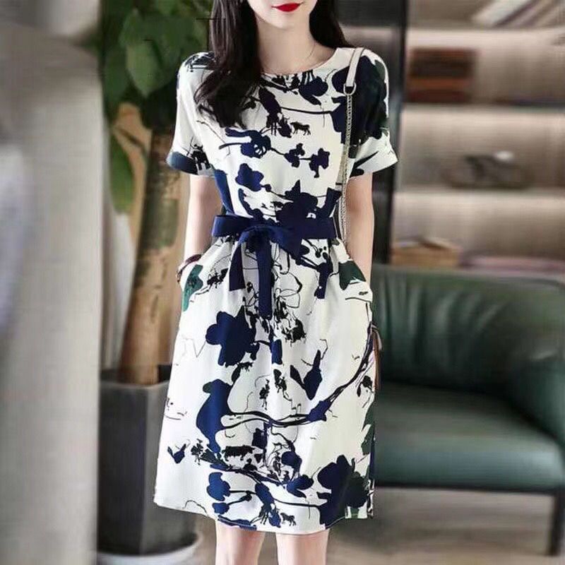 本日の新製品 ワンピース レディース 40代 きれいめ 膝丈ワンピース 夏 半袖ワンピース プリント リボン Aラインスカート オシャレ韓国風 大人ゆったり