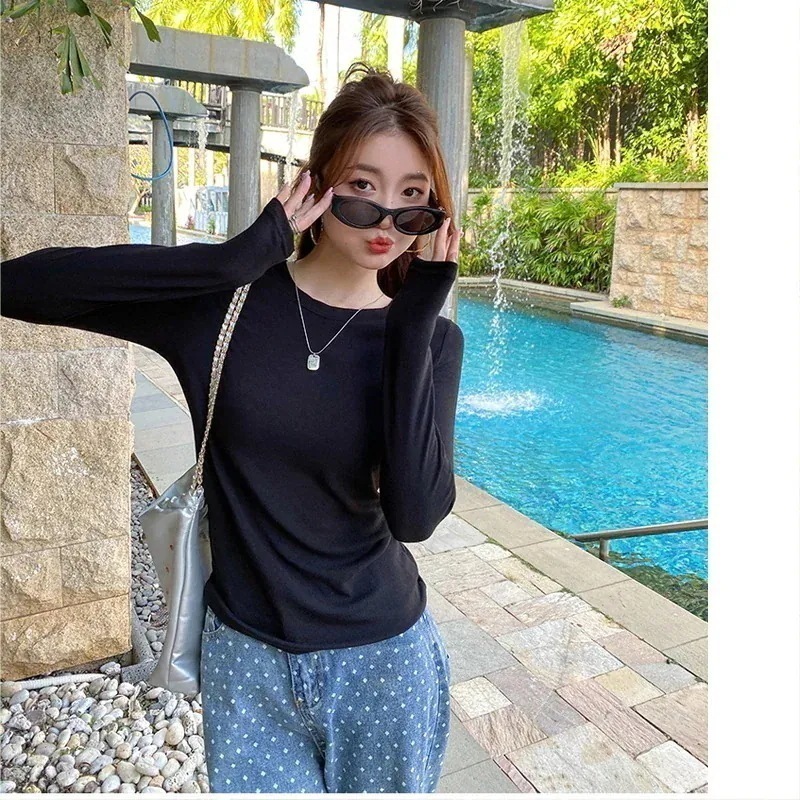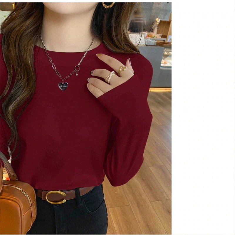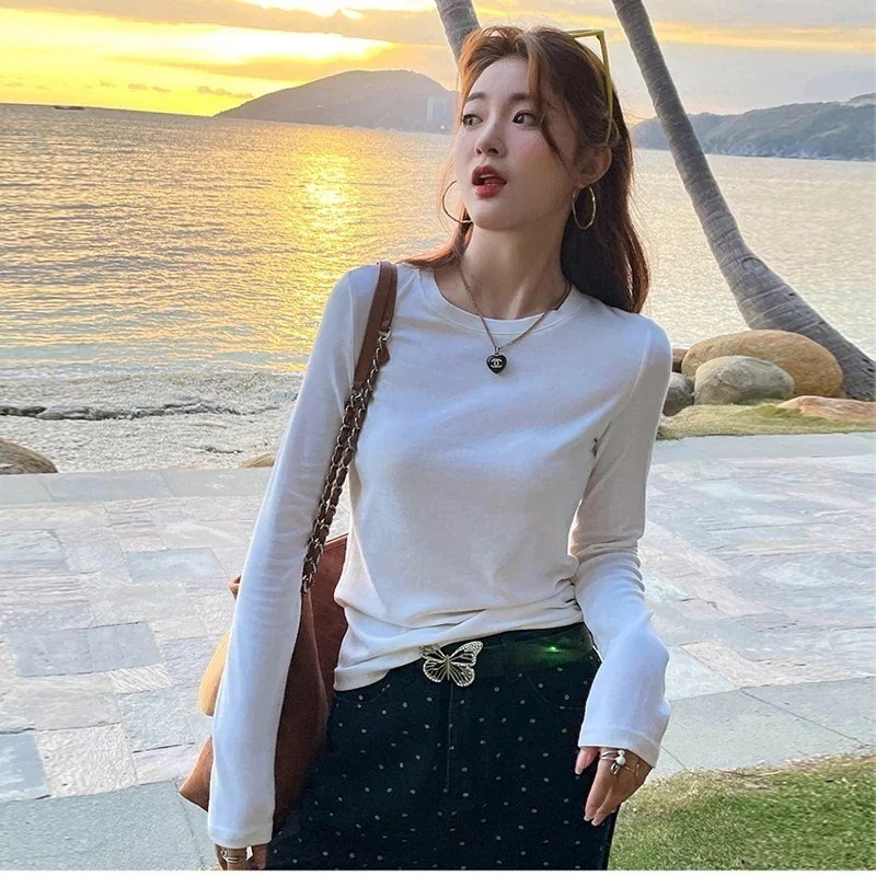 [急速出荷]ベーシックニット Tシャツ 長袖 ホワイト ファッショナブル 初秋 2026 インナーウェア 女 ボトムシャツ ラウンドネック