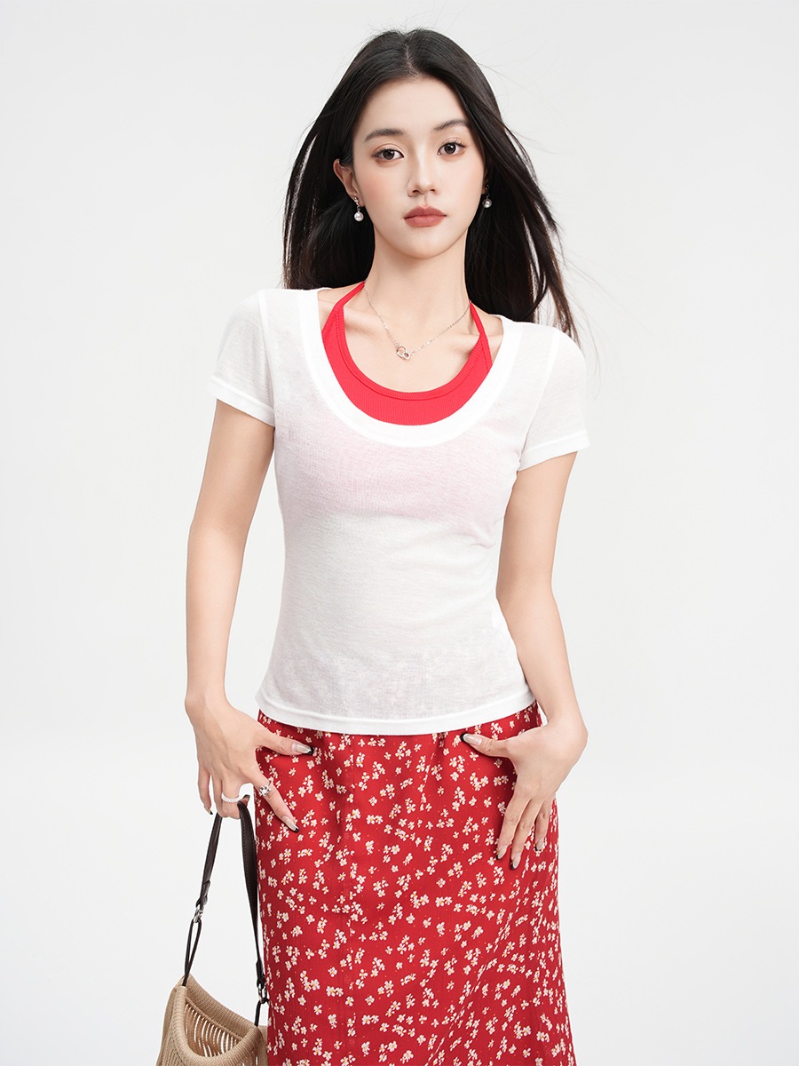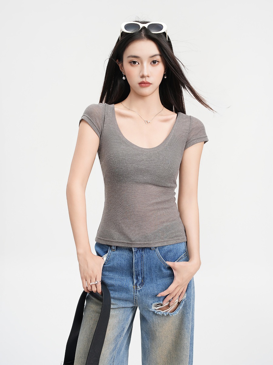 2025新作入荷 春夏 シースルー Uネック 正肩トップス Tシャツ 半袖 レディース 薄手 フィット シェイプアップインナー