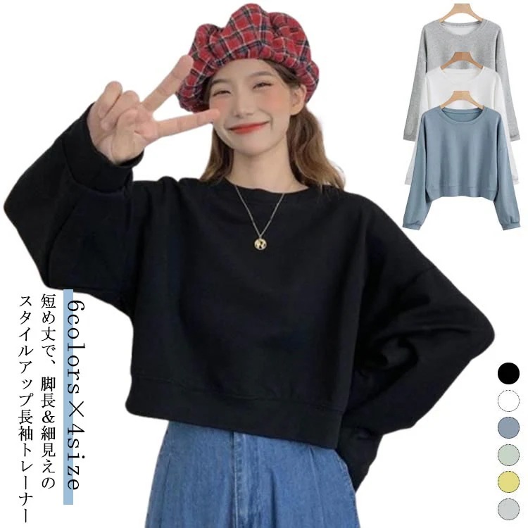 ドロップショルダー トレーナー お洒落 カットソー 長袖 クロップドプルオーバー 薄手 スタイルアップ トップス 短め丈 ワンマイルウェア tシャツ レディース 部屋着 可愛い クロップドプルオーバー