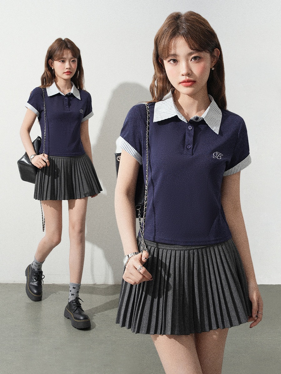 2025新作入荷 ネイビー フェイクツーピース レディースファッション レディース服 半袖 Tシャツ トップス カラーブロック ポロカラーレディース 正肩
