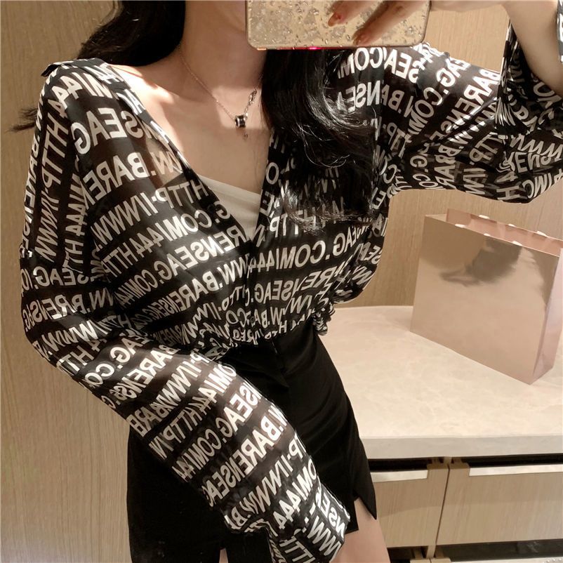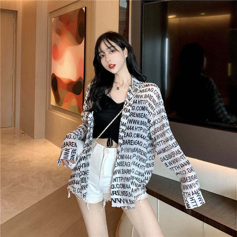 夏韓版港味感アルファベットシャツゆったり長袖日焼け止めコート女+セクシーニットキャミソール
