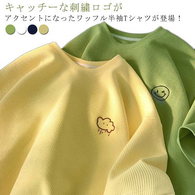 Tシャツ ワッフル 刺繍 ロゴ レディース トップス 春 夏 秋 半袖 プルオーバー 丸首 クルーネック カットソー 無地 サーマル シンプル カジュアル ゆったり 大きいサイズ 柔らかい ワッフル編