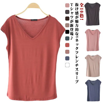 全10色!Tシャツ レディース ノースリーブ トップス カットソー フレンチスリーブ Vネック 大きサイズ 薄手 無地 30代 40代 伸縮性 ゆったり カジュアル 夏服 モダール