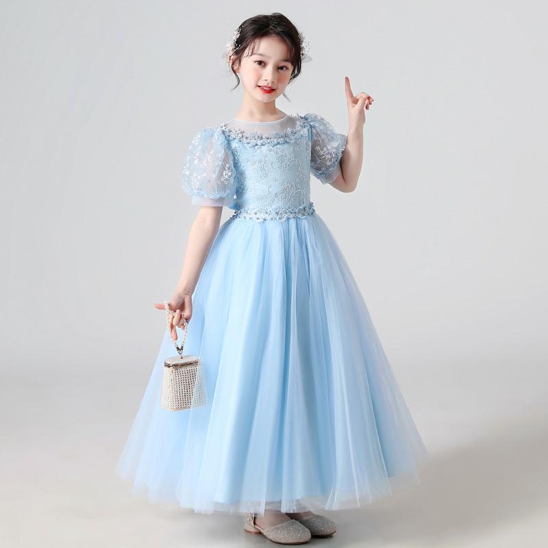 ワンピースロングドレス パフスリーブ 子供ドレス 発表会 ピアノ フォーマル 卒業式 演奏会 入園式 誕生日 ジュニア 刺繍