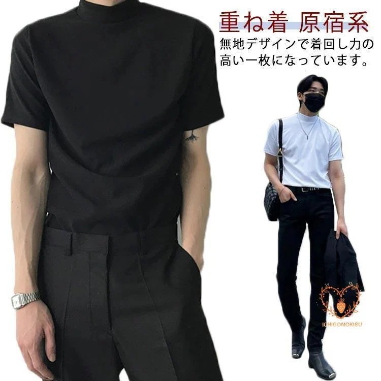 の 韓国風 ストリート ック tシャツ 半袖 メンズ カットソー 無地 トップス モックネック インナー ボトルネック 夏 春 秋 冬 ゴルフウェア