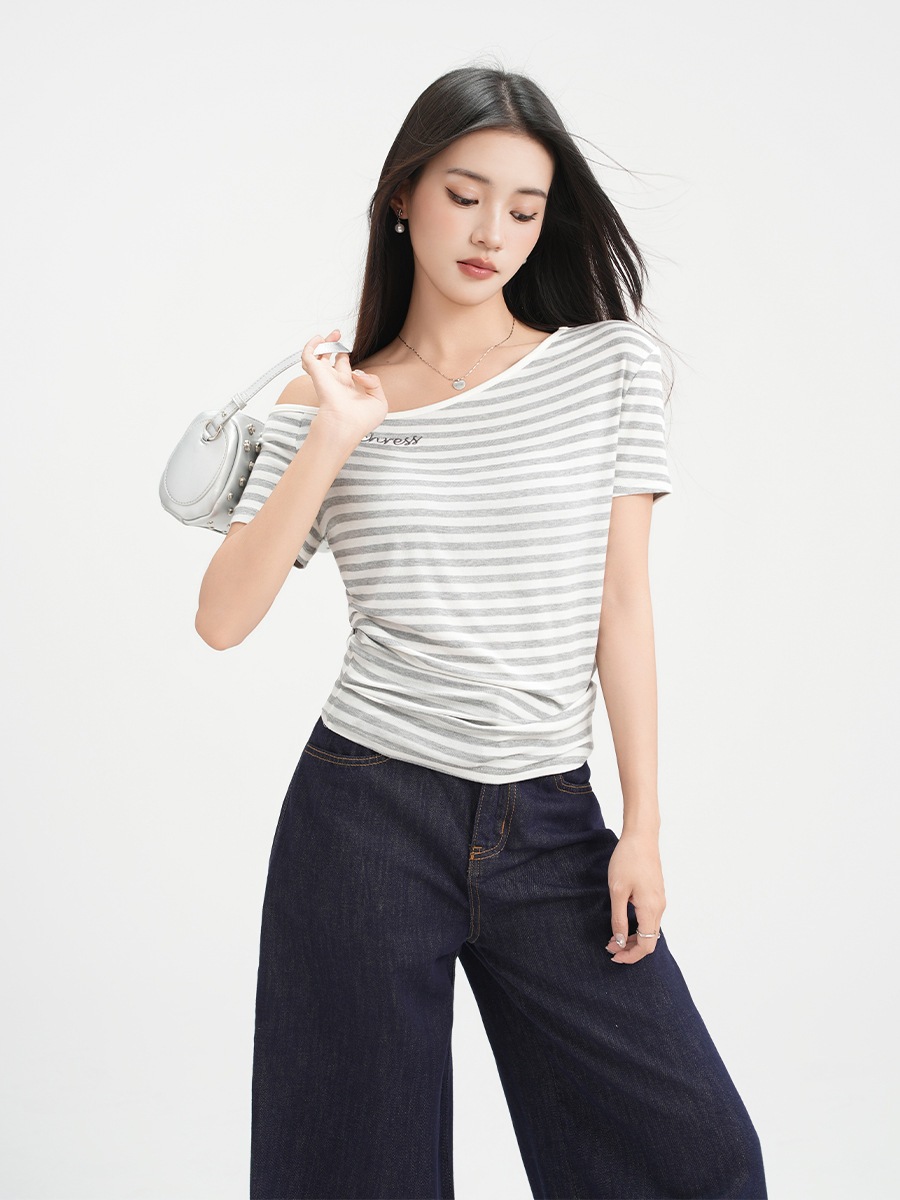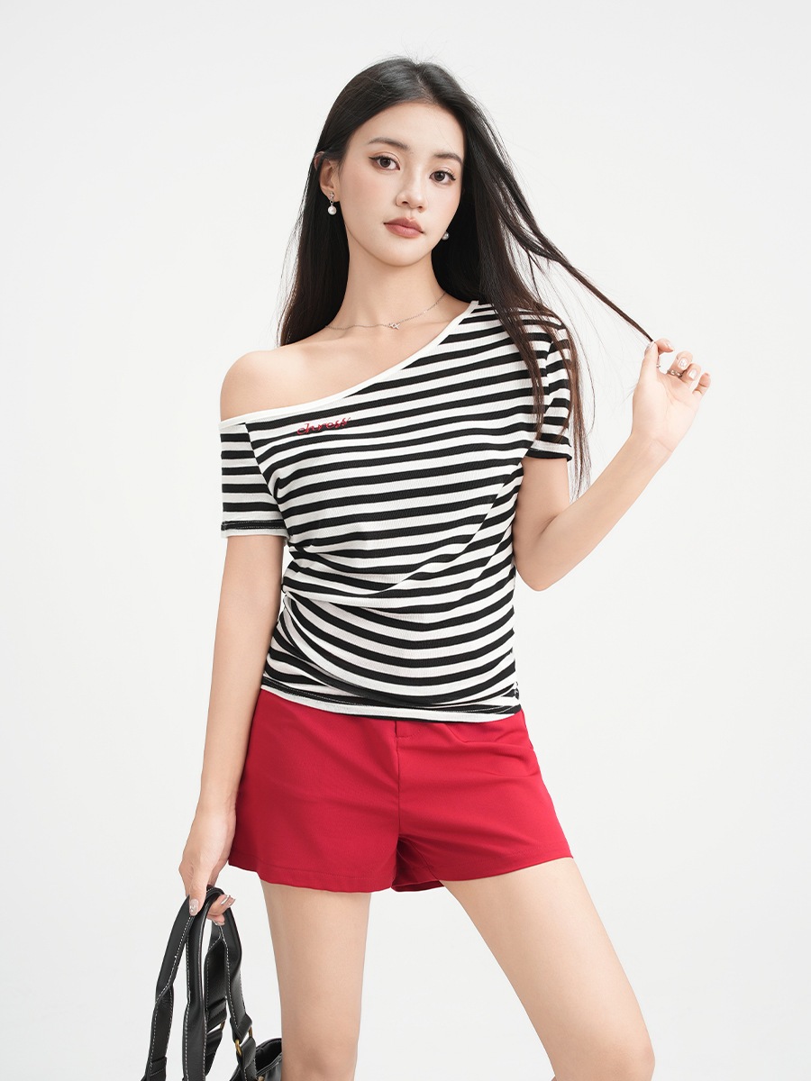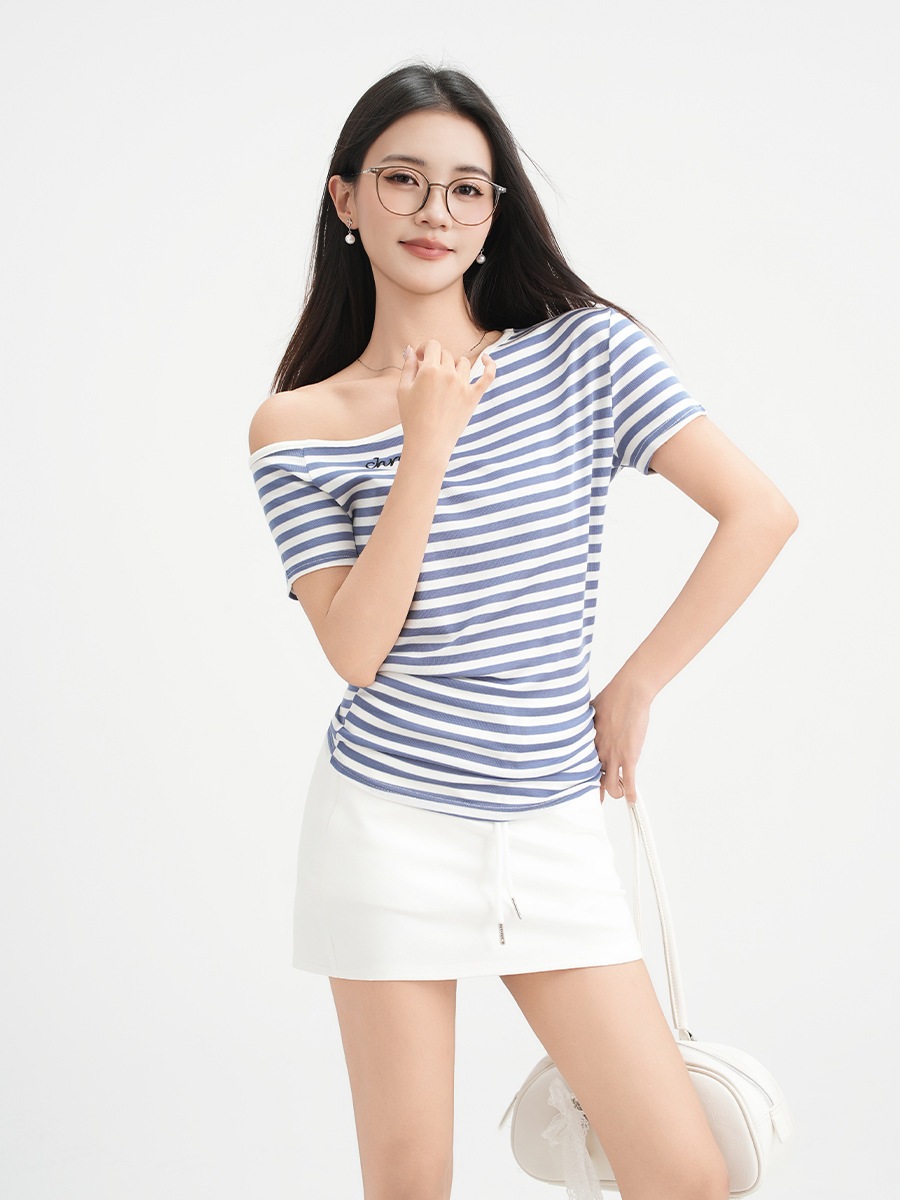 2025新作入荷 斜めオフショルダー カラーブロックストライプ刺繍 トップス 半袖 Tシャツ レディース 絶品 上品 ボディコン トップス
