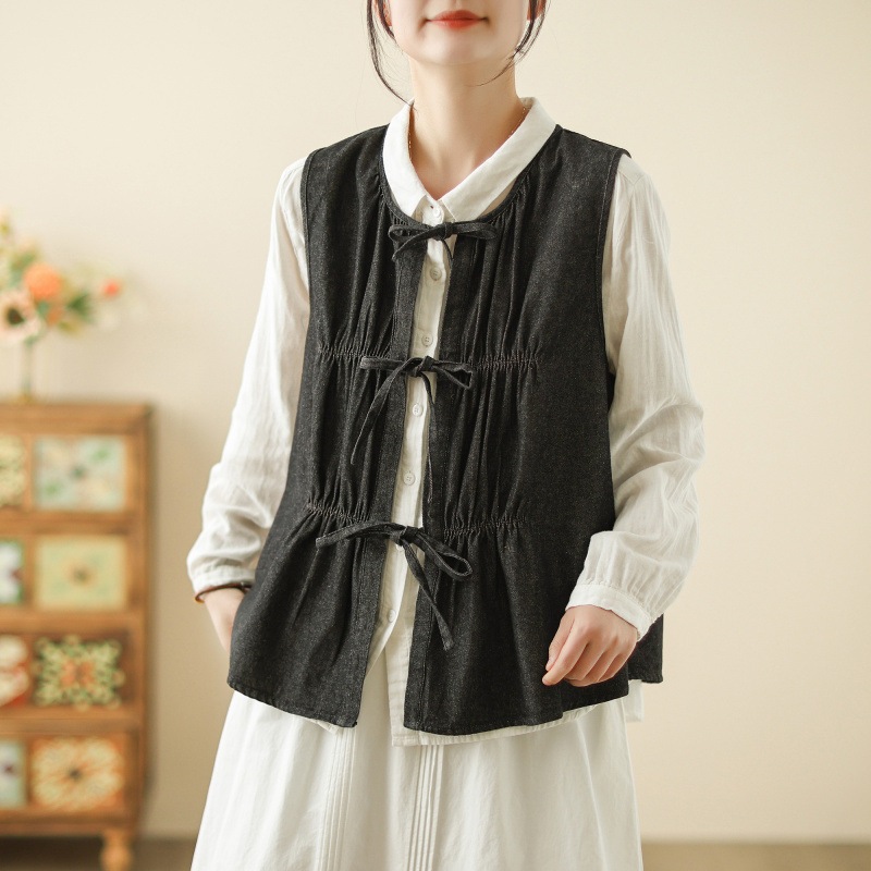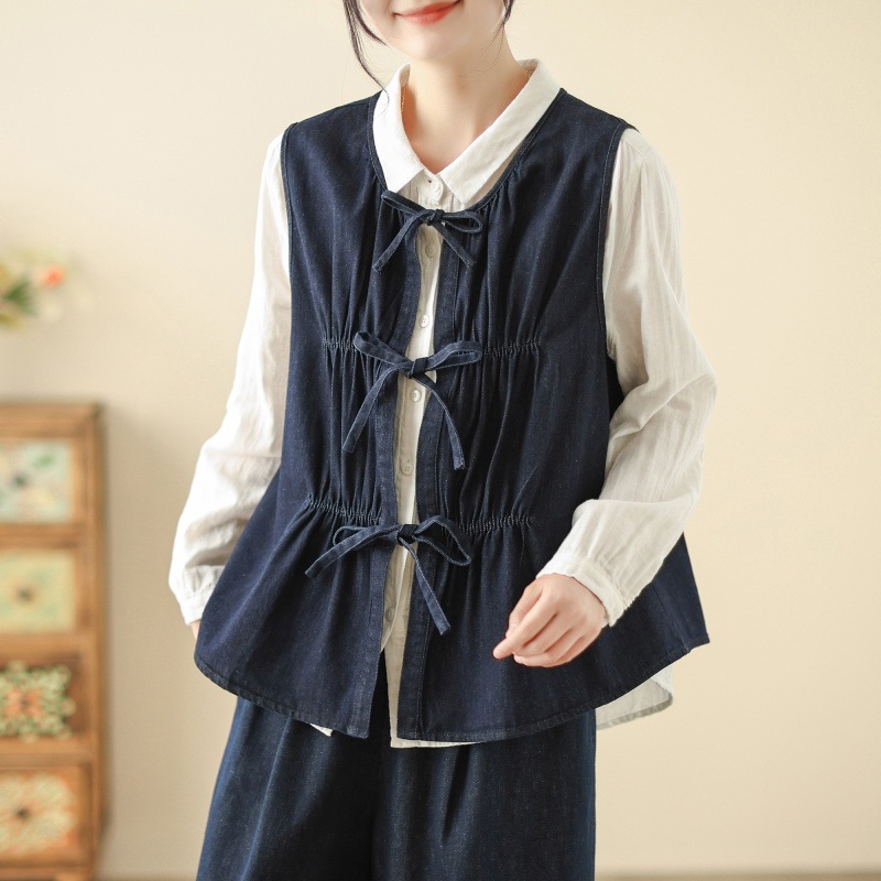 レディース無地ゆる紐ノースリーブタンクトップ重ね着コート森系デニムベスト-62