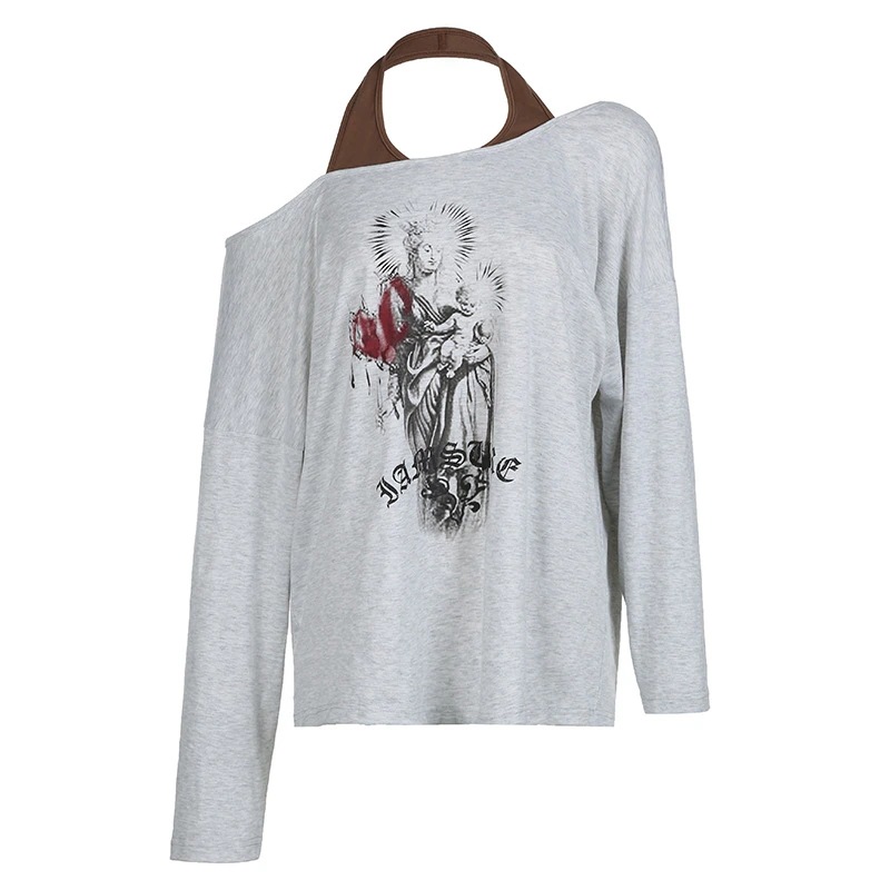 2025春夏フェイクレイヤード ロンT オフショルダー オーバーサイズ フェイクツーピース tシャツ トップス 長袖 ルーズ レトロ