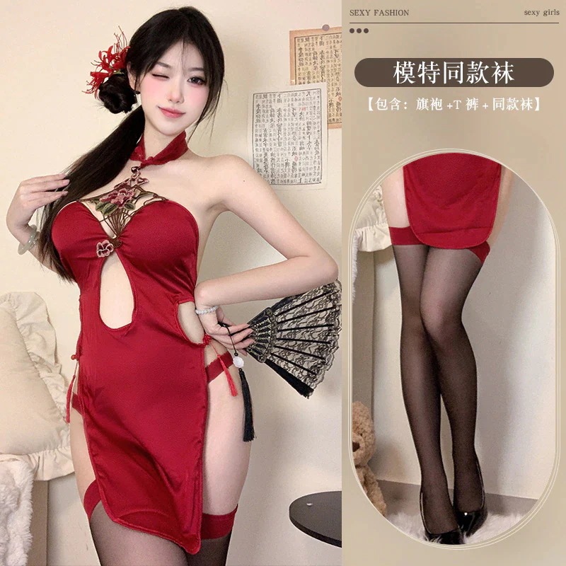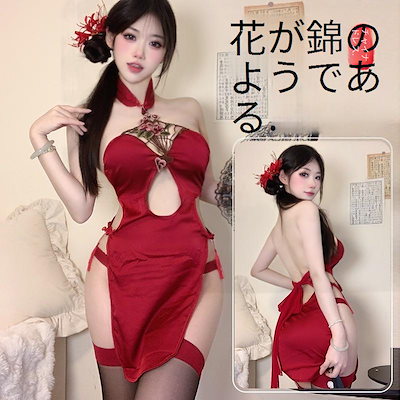 エロティックなランジェリーセクシーな古風な牡丹 刺繍吊りネックビブ大きな赤い花嫁レース中空制服誘惑ロールプレイ下着付き