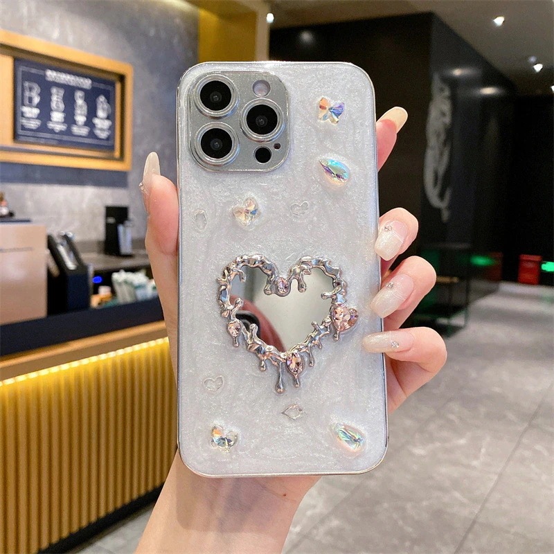 アップル15フルパッケージ14韓流13女性のための接着剤ラインストーン愛ミラーiPhone16Promaxの携帯電話ケースを滴下