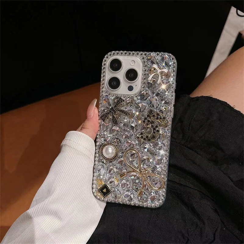 iPhone15Promaxの携帯電話ケースのアップル14ラインストーンの弓13豪華なフルダイヤモンド16真珠のために適した