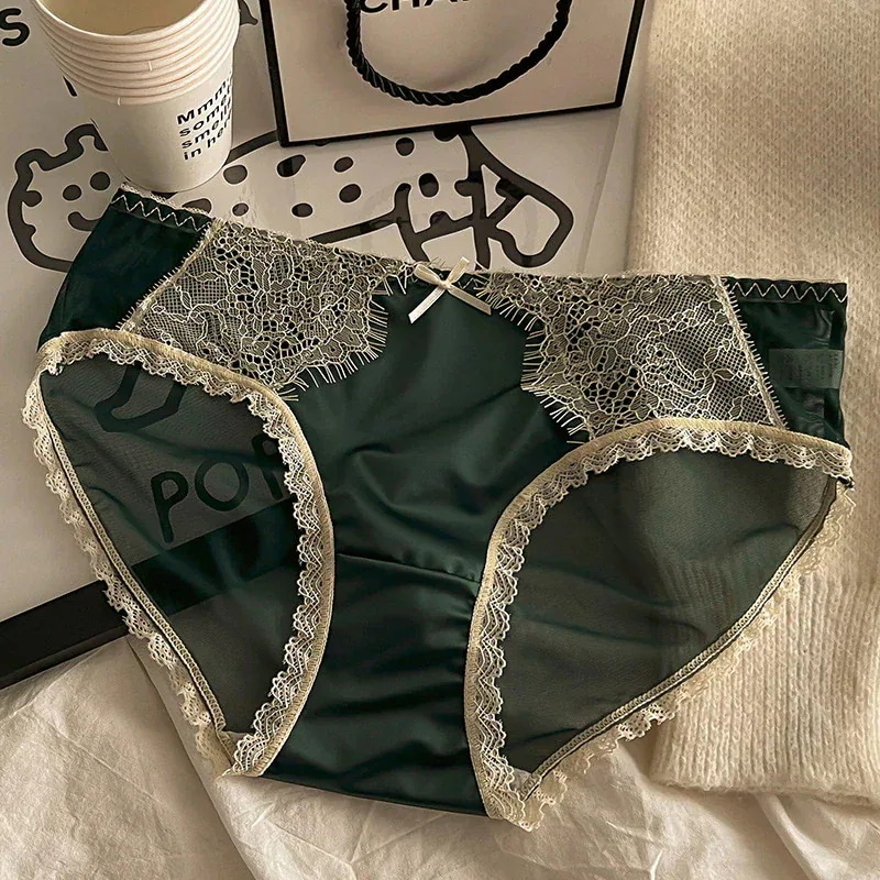 ビンテージ高級レースショーツ女性 フランスのまつげスプライシングサテン快適で通気性の綿クロッチミドルライズショーツ女性のショーツ