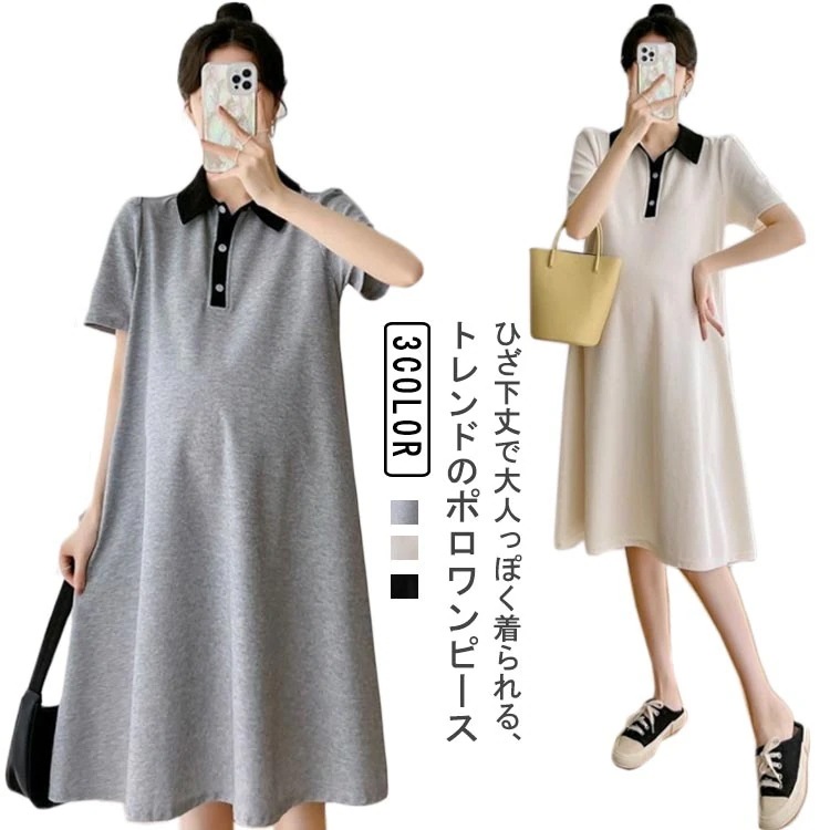 マタニティ 夏 フレアワンピース Aライン ポロカラー 半袖 妊婦服 ワンピース バイカラー ポロワンピース ひざ下丈 体型カバー おしゃれ 可愛い ゆったり 配色