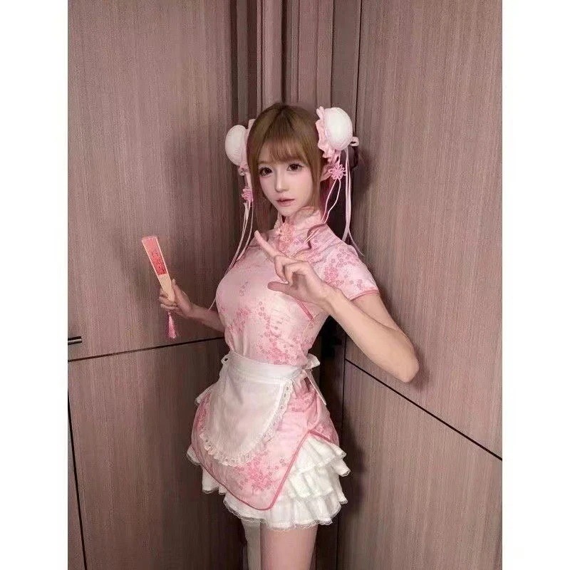 コスプレ チョンサムセクシースリム薄いカントリースタイル改良された小さなコックドレスエプロン