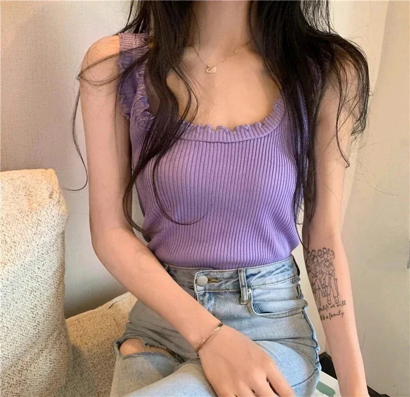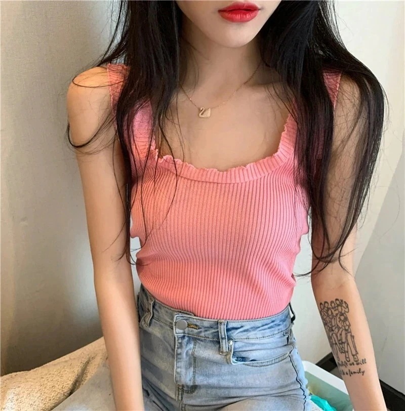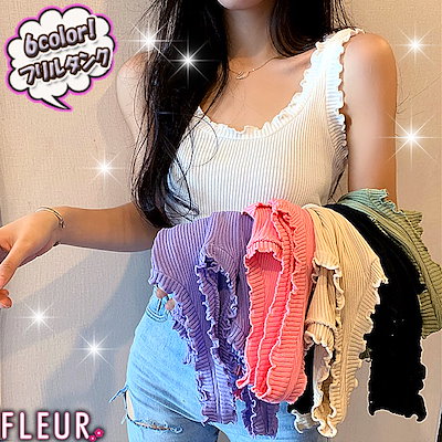 【3日出荷】リブニット フリル タンクトップ インナー レディース パステル ホワイト ラベンダー ピンク 夏