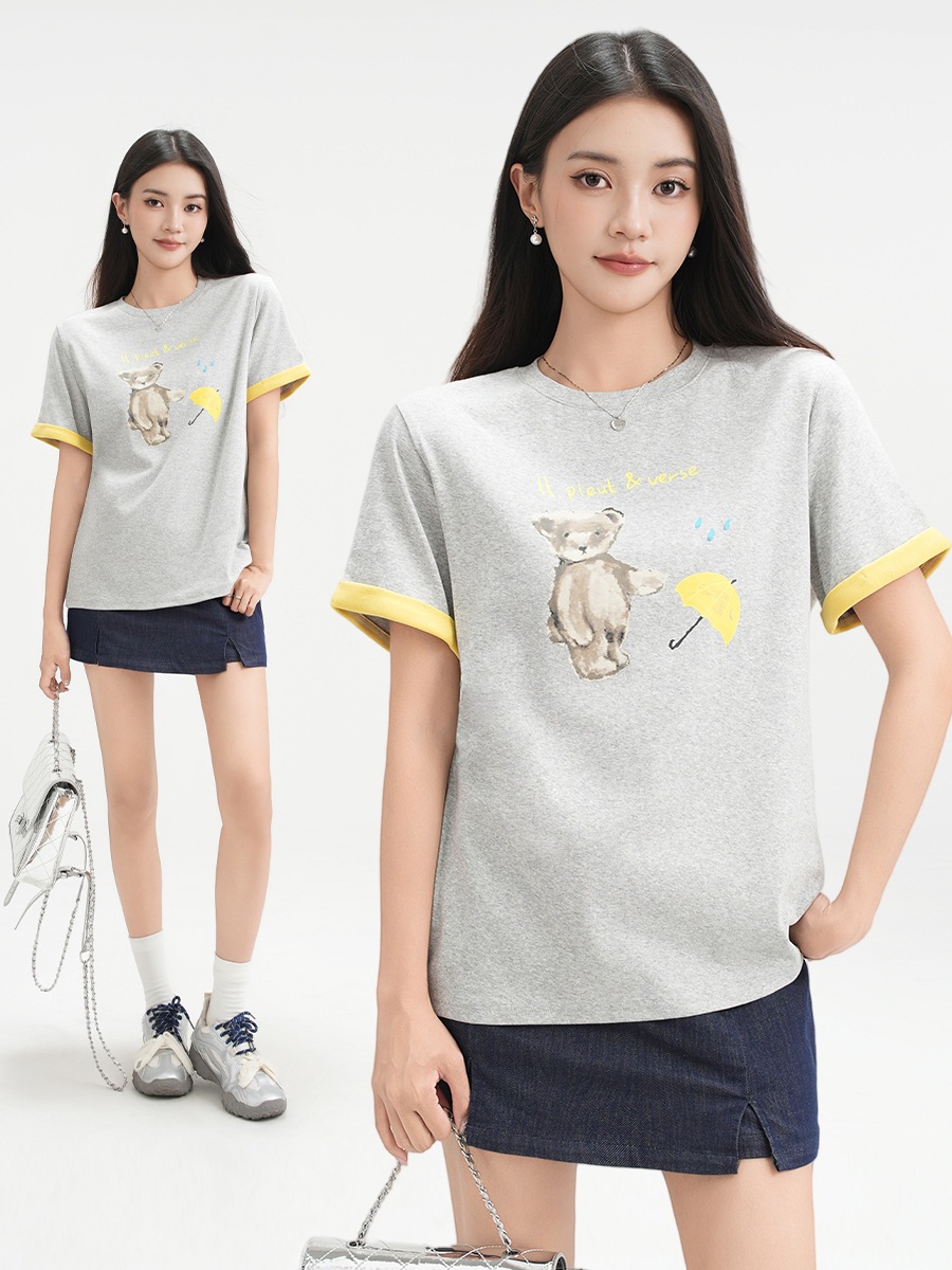 2025新作入荷カラーブロック×ベアプリント 丸首ルーズ トップス 半袖 Tシャツ レディース ゆったりシルエットトップス