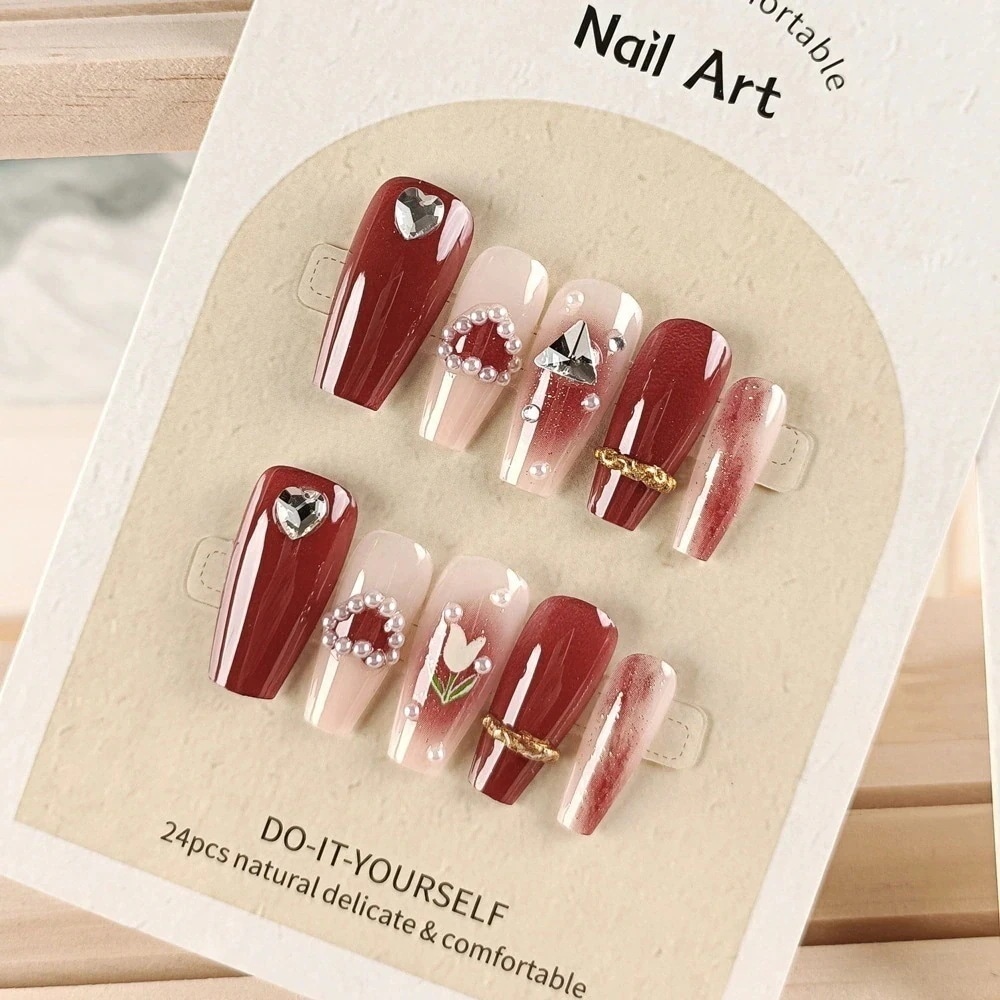 立体光治療ウェアネイルハンドメイドネイル24ピース ホワイトレッドハートネイルチップ ショート リップパールネイルシール
