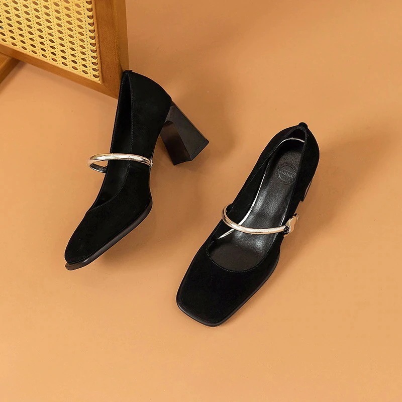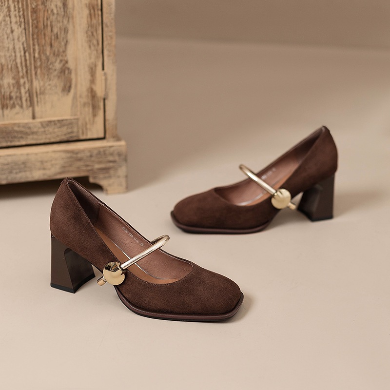 韓国通勤シングルシューズの女性2026春夏の新型スクエア靴いハイヒールの金属ボタンのメアリー珍靴パンプス