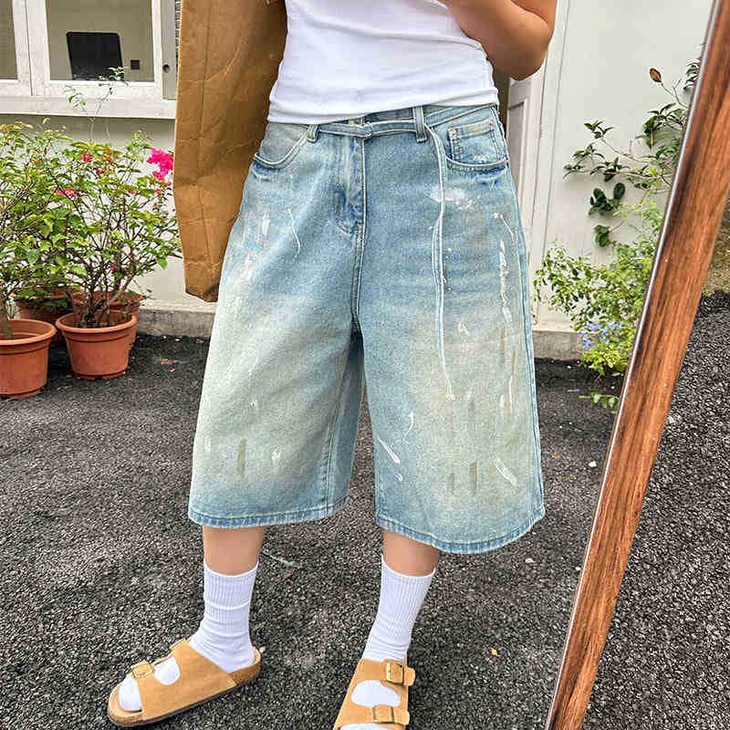 アメリカンレトロサマーコーティングダック7分丈ジーンズレディース ゆったりストレートミッドパンツウォッシュドオールドスリムワイドレッグショーツジーンズ