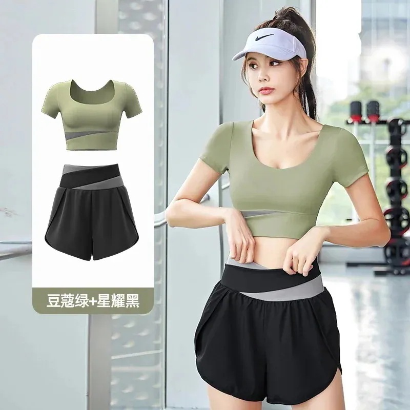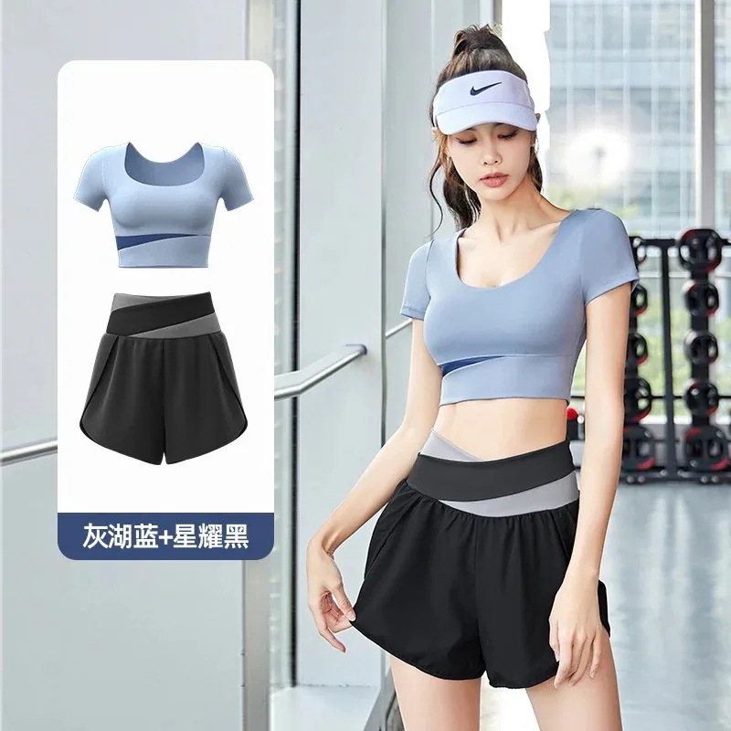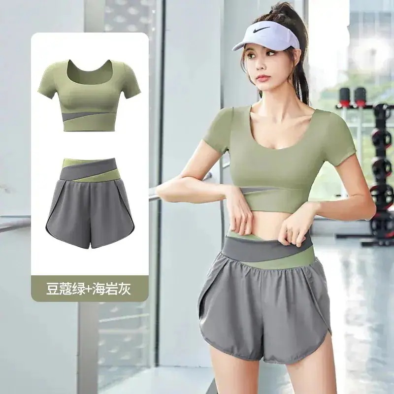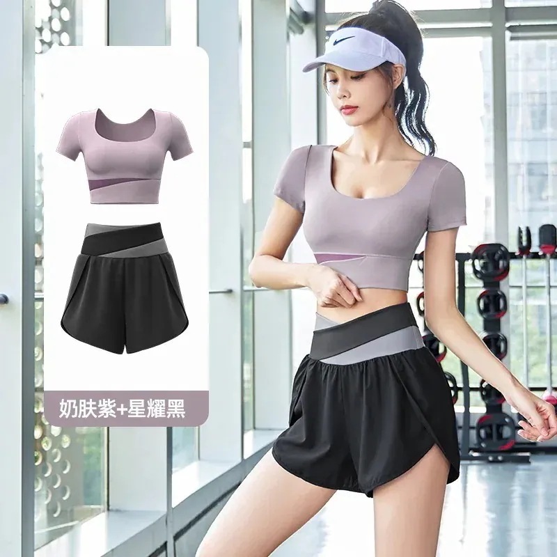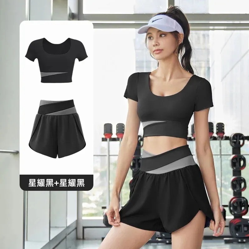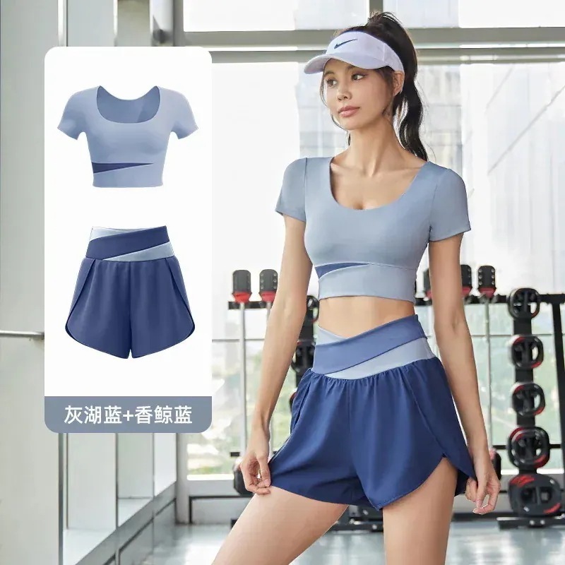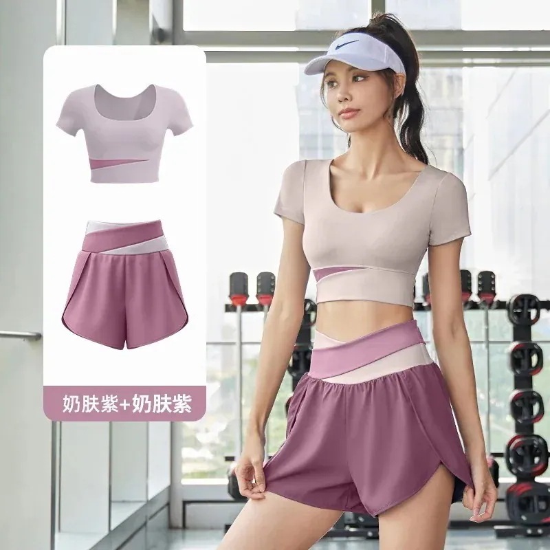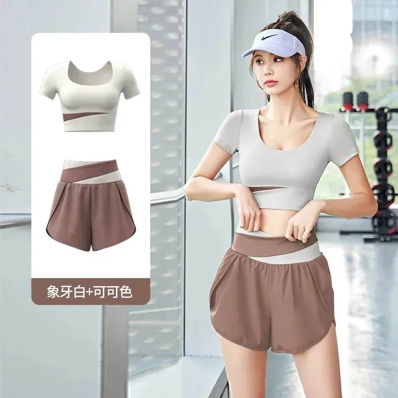 ヨガウェア上下セットカップ付き 半袖 おしゃれヨガウェアサマーカラーブロッキング速乾スーツ フィットネスセット ヌードスポーツセット 通気性痩身ヨガスーツ