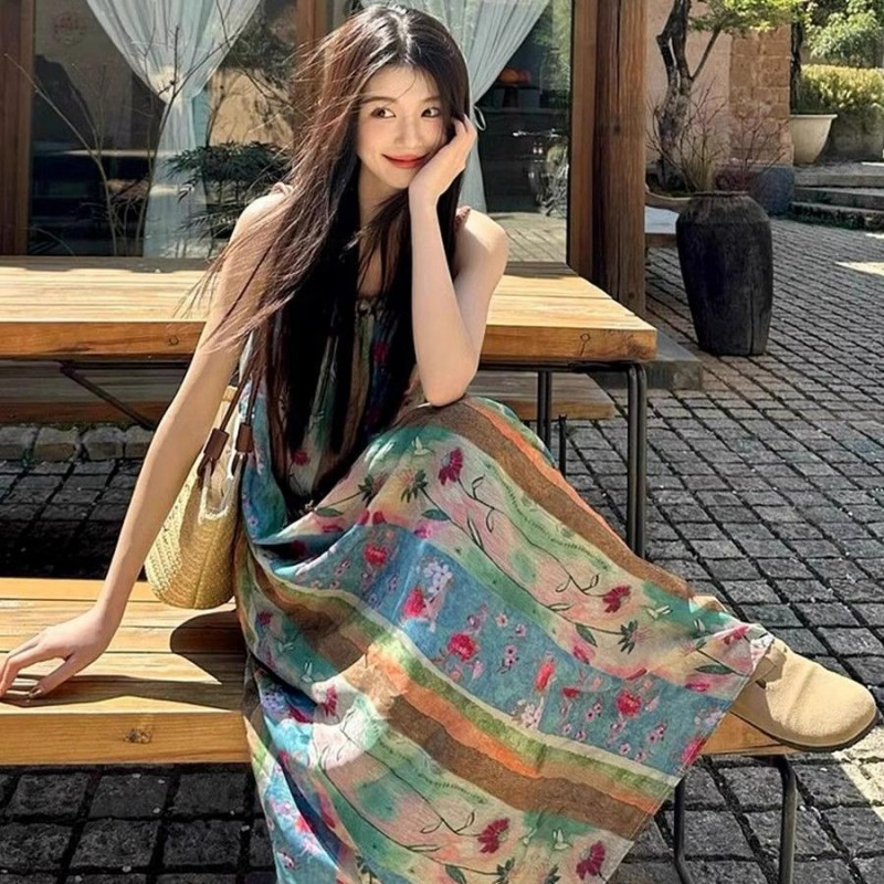 キャミソールワンピース 2025年夏の新作 レトロ風 花柄ワンピース おしゃれ ノースリーブ かわいい 元気 小柄さん用 マキシワンピース 女の子 バカンスや日常のお出かけに