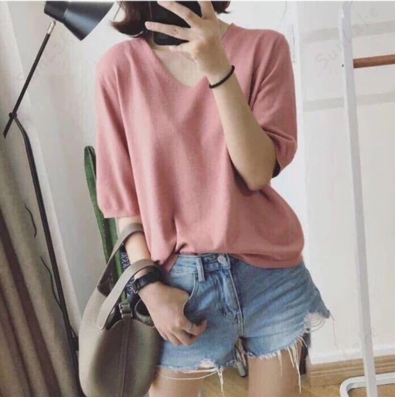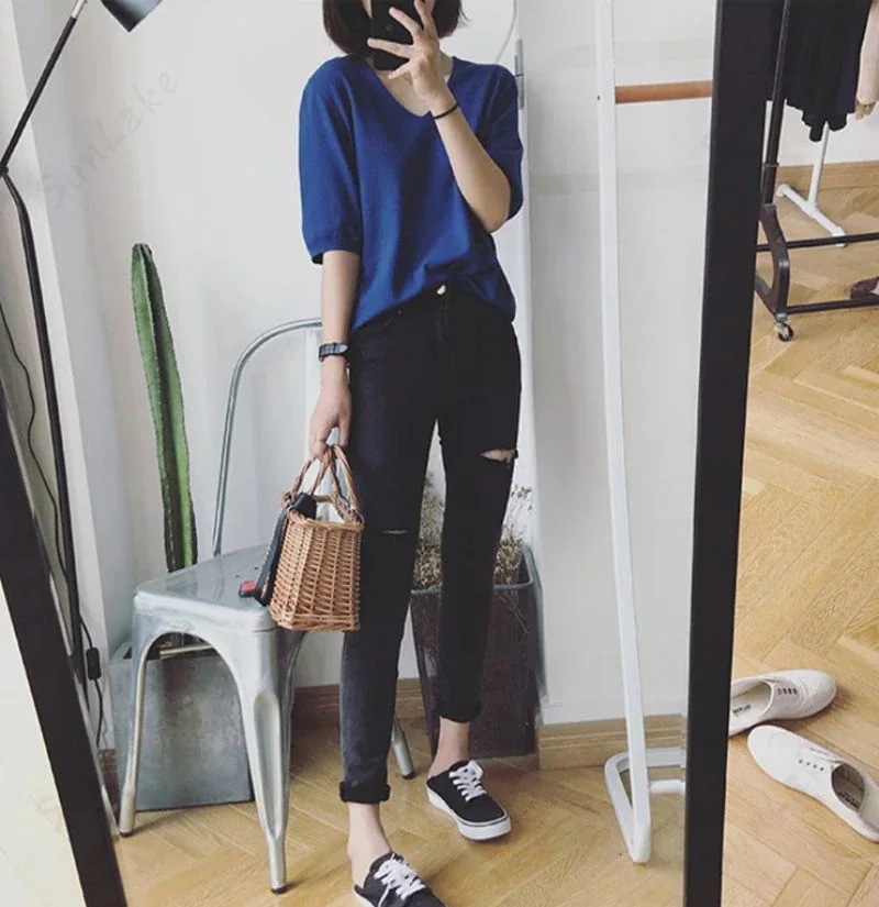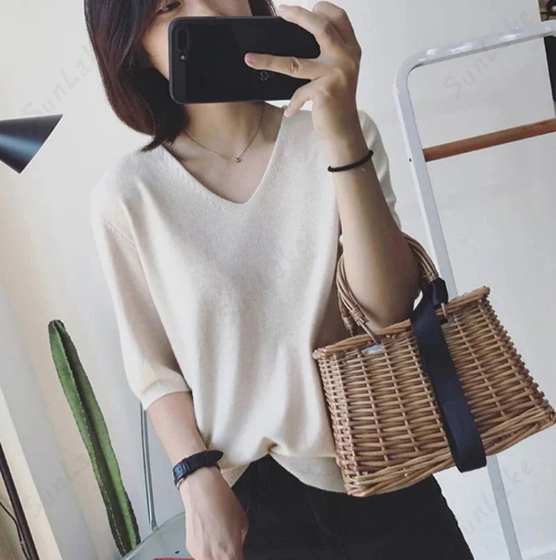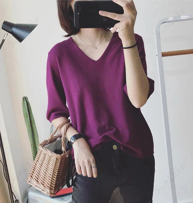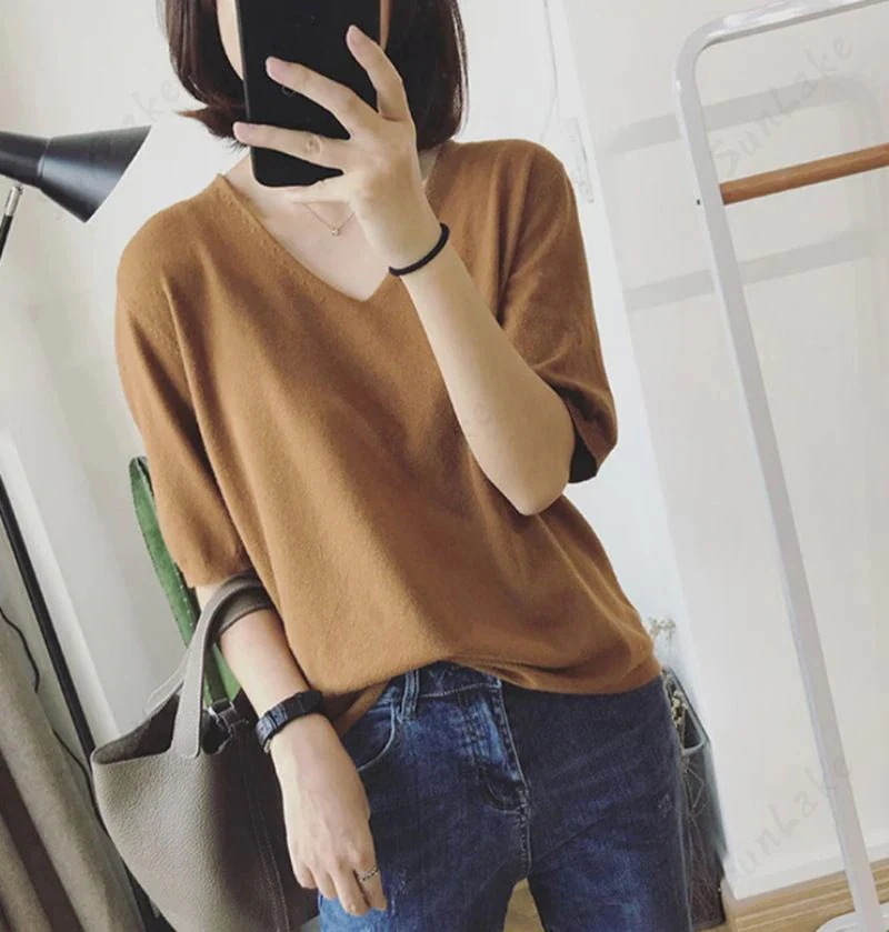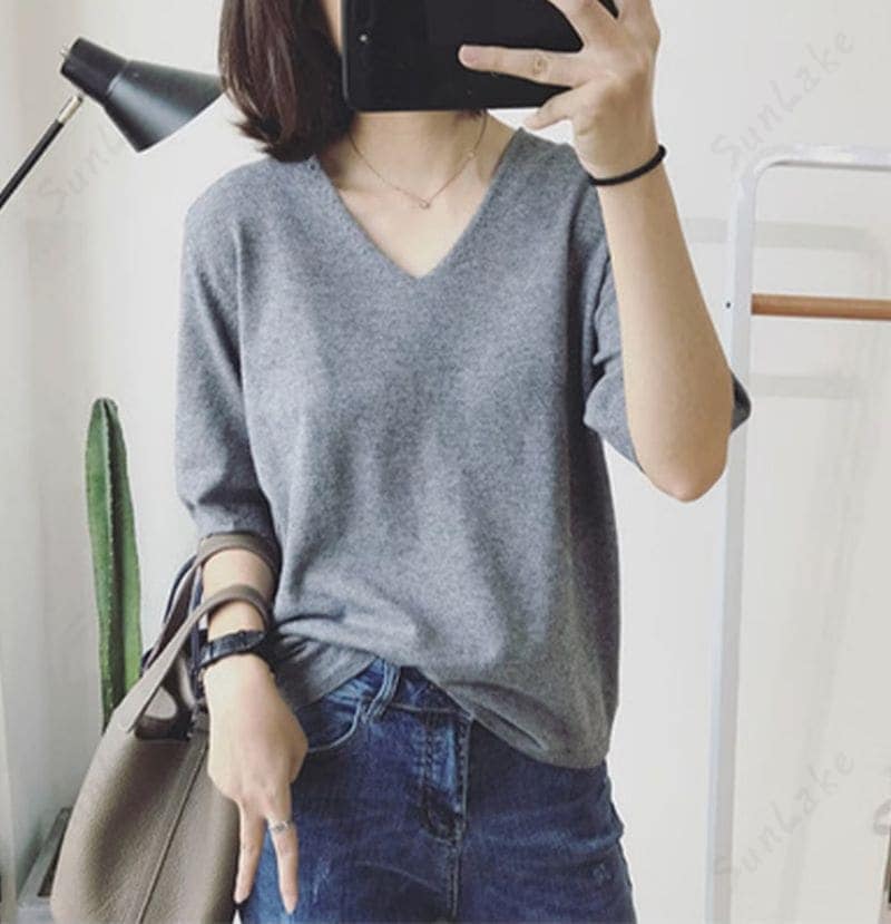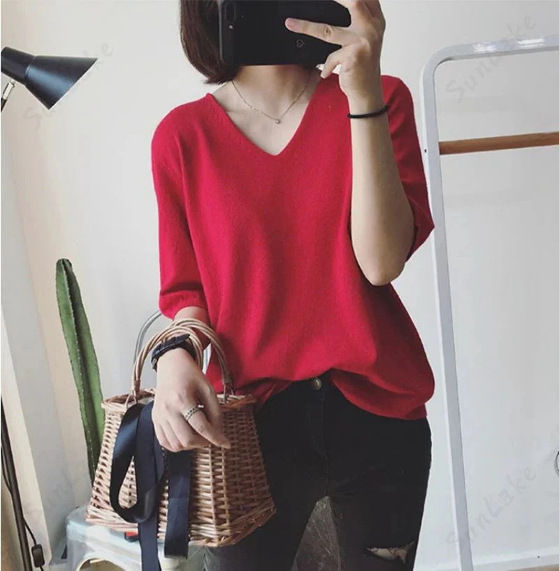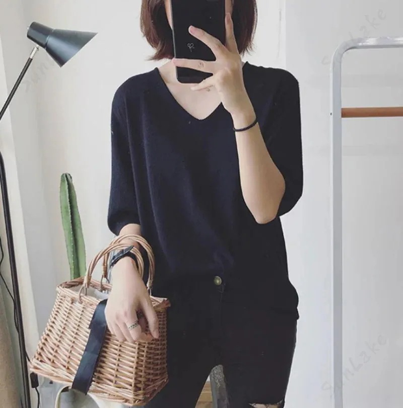2枚購入100円割引!プレゼント レディース 万能ニット 透けない サマーニット5分袖 Tシャツ Vネック ゆったり ファッション夏服 トップス 無地