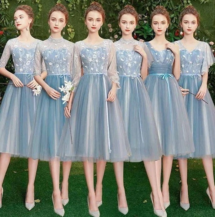 [送料無料]ブライズメイド ミモレ丈 ブルー ピアノ発表会 ドレス 大人 袖付き カラードレス 結婚式 パーティードレス 20代 30代 40代 謝恩会 披露宴 同窓会 女子会