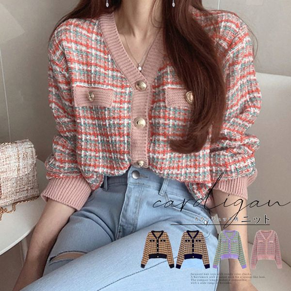 [送料無料]チェック柄 ニット カーディガン レディース ツイードニットカーデ 長袖 着やせ カラーチェック
