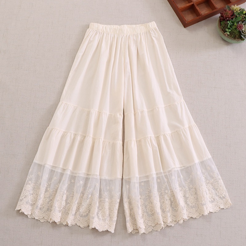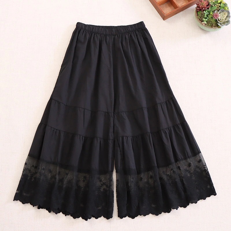 [送料無料]ロング 裾レースパンツ ゴム ペチパンツ パンツ 綿 体型カバー 夏 レディース レース ズボン ペチコート ボトムス フレアパンツ ワイド 刺繍 黒 白 ベージュ 大きいサイズ 秋 冬