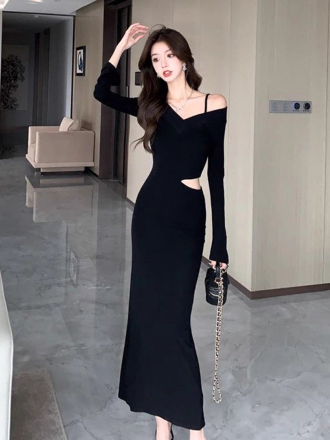 ブラックデザイン肩出し長袖ワンピース女25新作ウエストアップ気質バッグヒップロングスカート パーティードレス