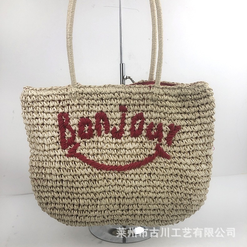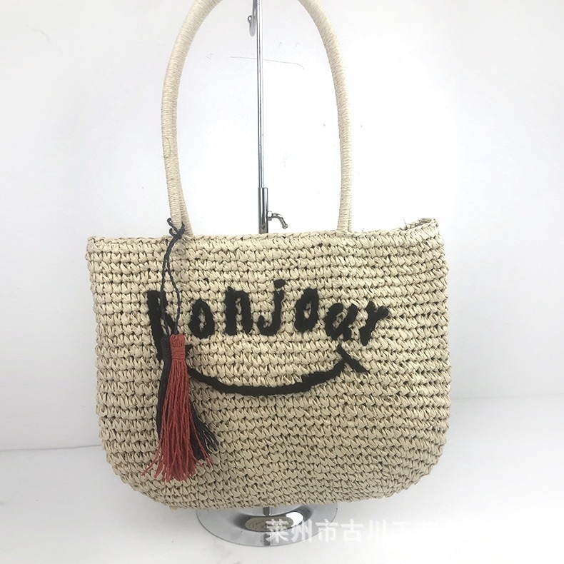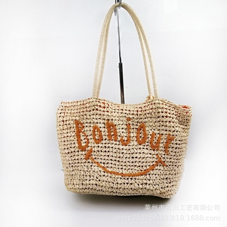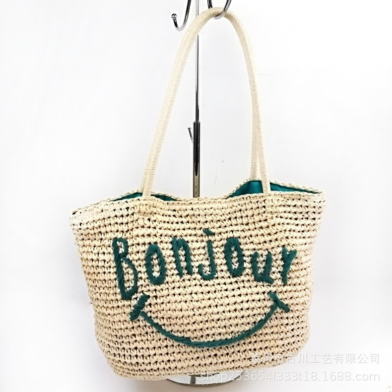 大量卸売レディース草編みバッグ海辺ビーチ手提げ編みバッグアルファベット笑顔女性バッグ卸売価格