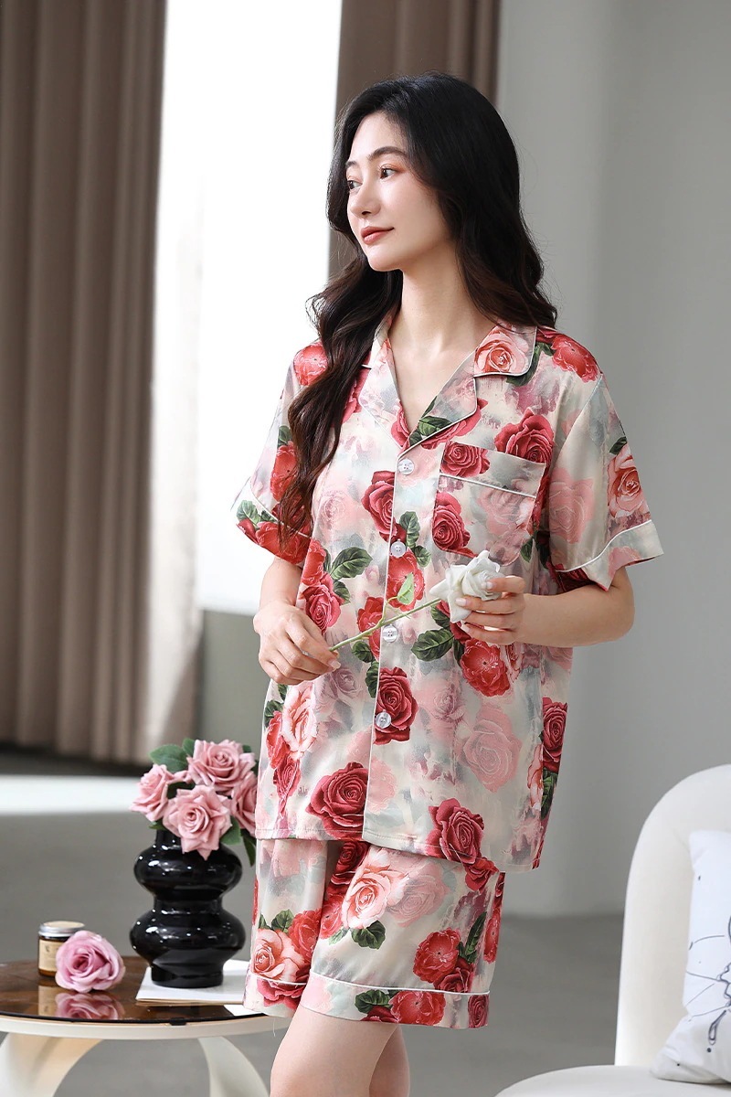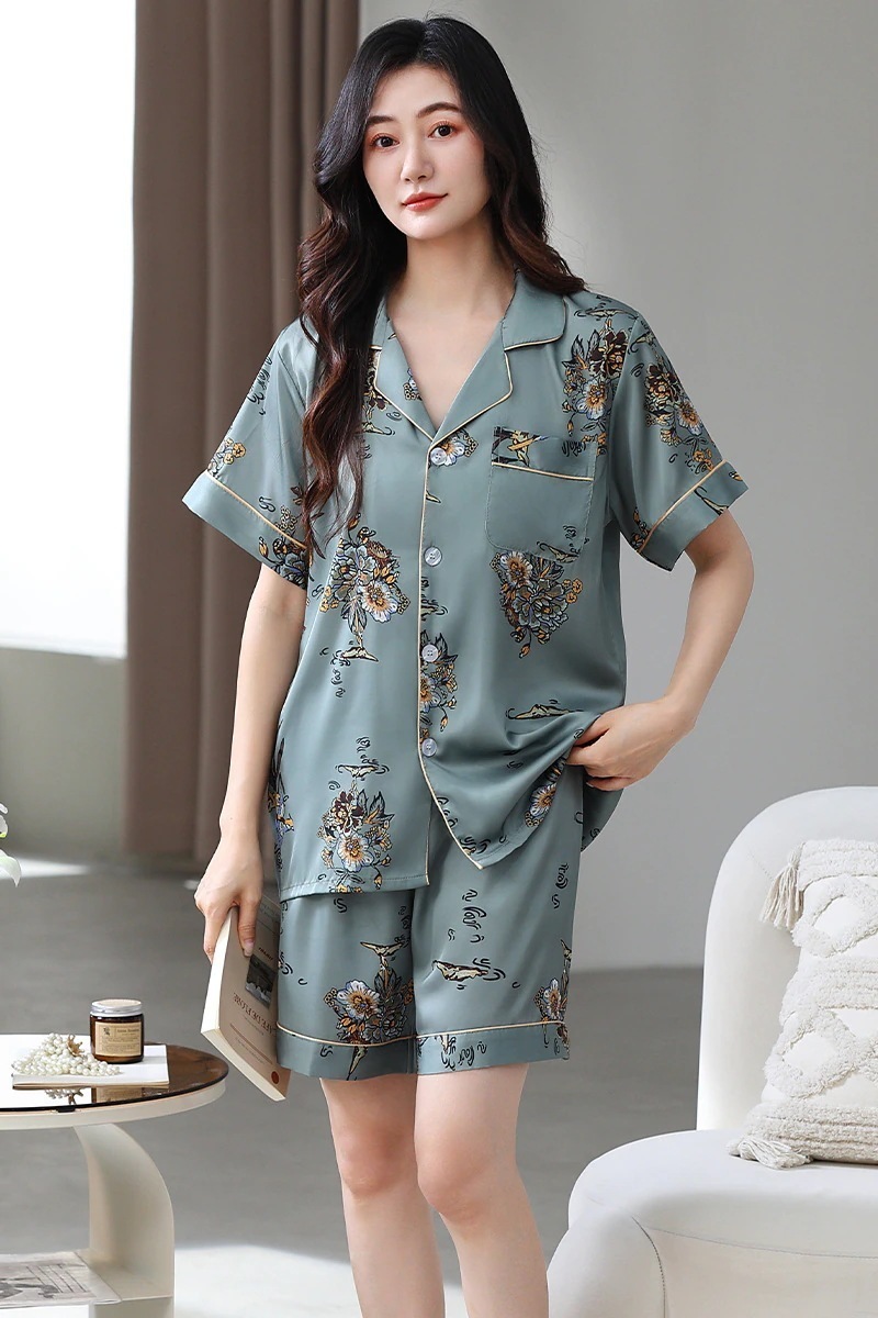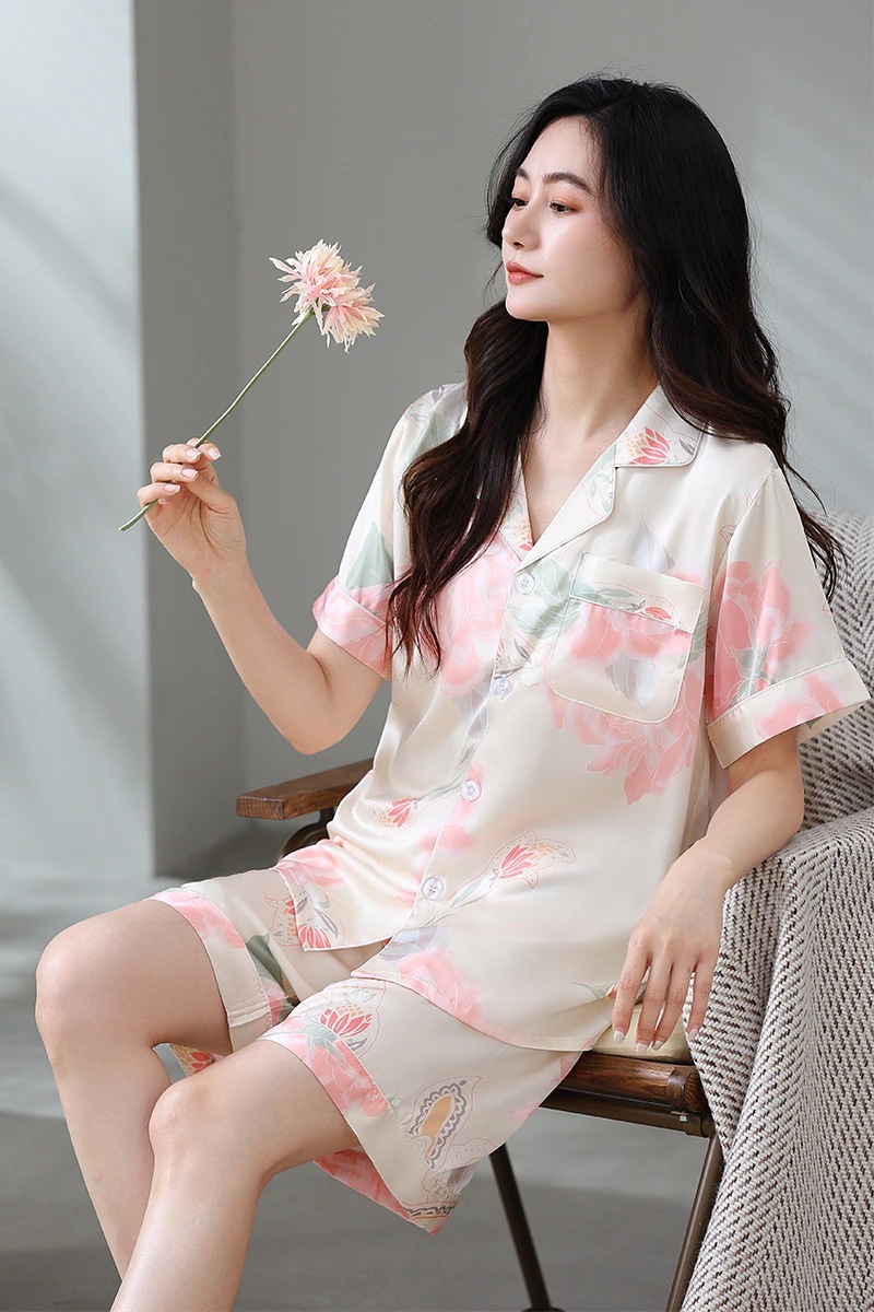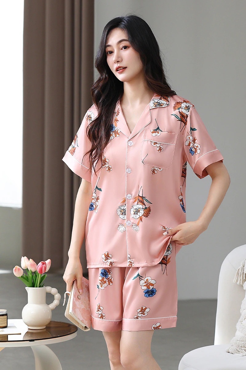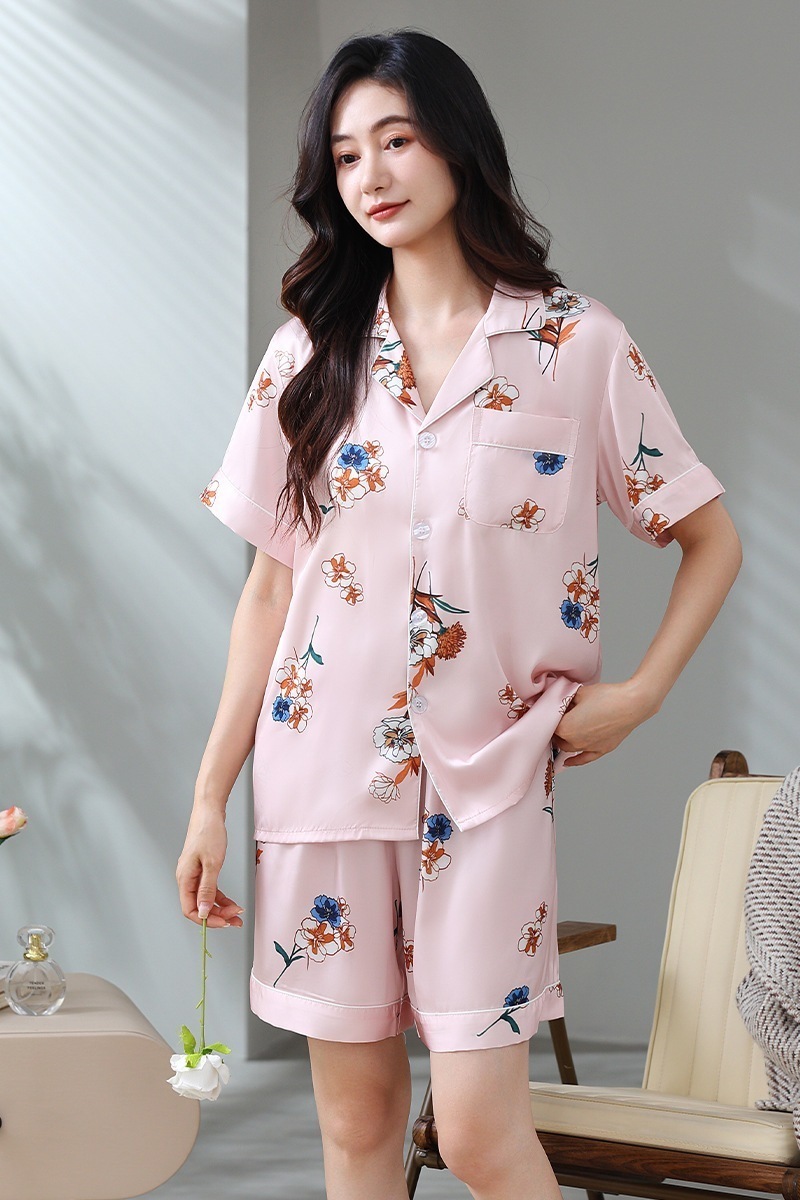 アイスシルクサテンパジャマ女性夏半袖ショーツシミュレーションシルク服 女性のスーツ軽量大きいサイズはホームウェアカジュアルウェアの外で着用することができます