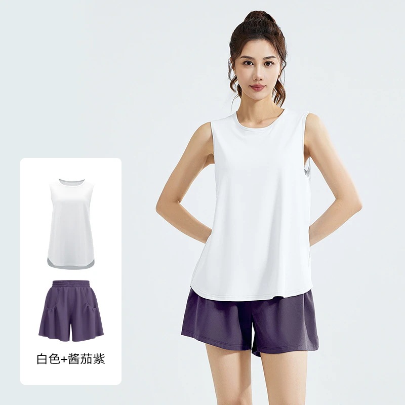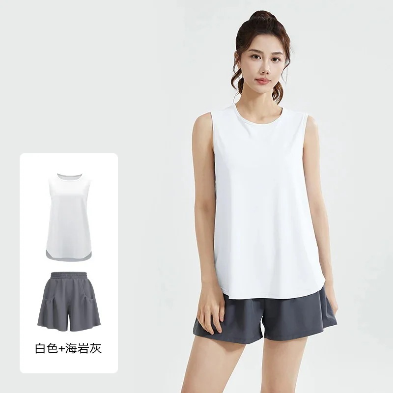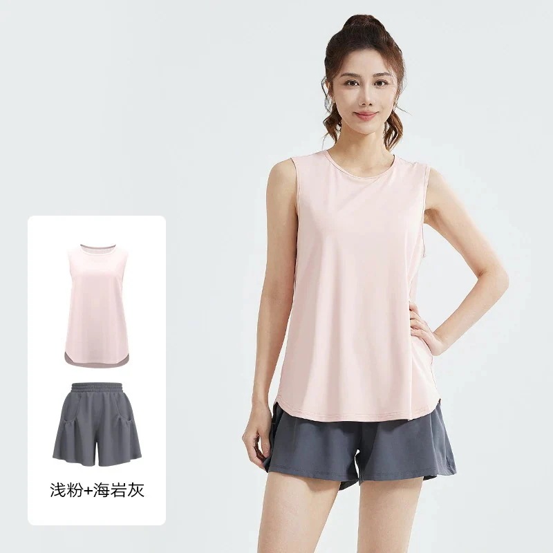 ヨガウェア上下セット カジュアルスポーツスーツゆったりランニング網糸美背ノースリーブタンクトップブラウスショートパンツスポーツスーツ女性