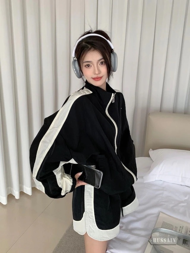 セットアップ レディース 上下セット 2点セット アウター ボトムス ジャケット パンツ 長袖 ショート 夏 レディース スポーツ カジュアル ワイドレッグ ジッパー 2色展開