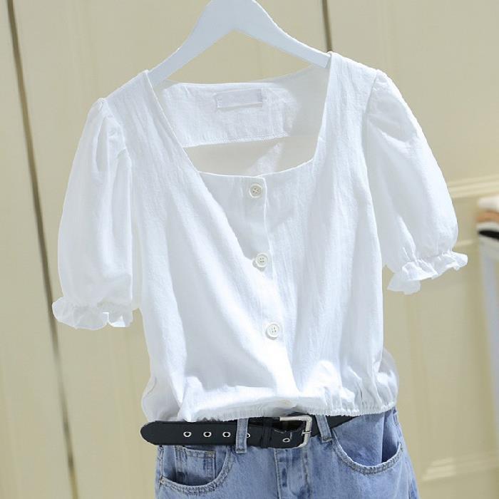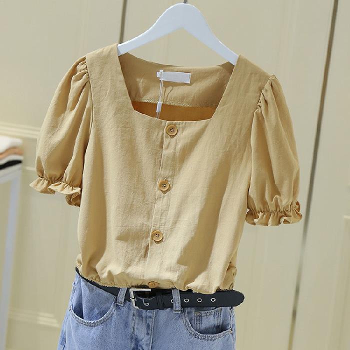 【2025夏】ゆったりバブルスリーブブラウス レディースクエアネック 鎖骨見せフレンチ風 短めデザイン 韓国風 大人可愛い