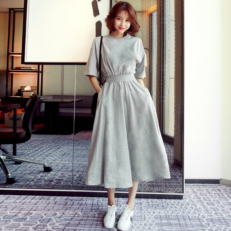 韓国 ワンピース タックシャツワンピース 薄手 大きなスカート 着やせ ワンピース レディース ロングワンピース ドレス 大きいサイズ ラウンドネック 通勤 通気性のいい