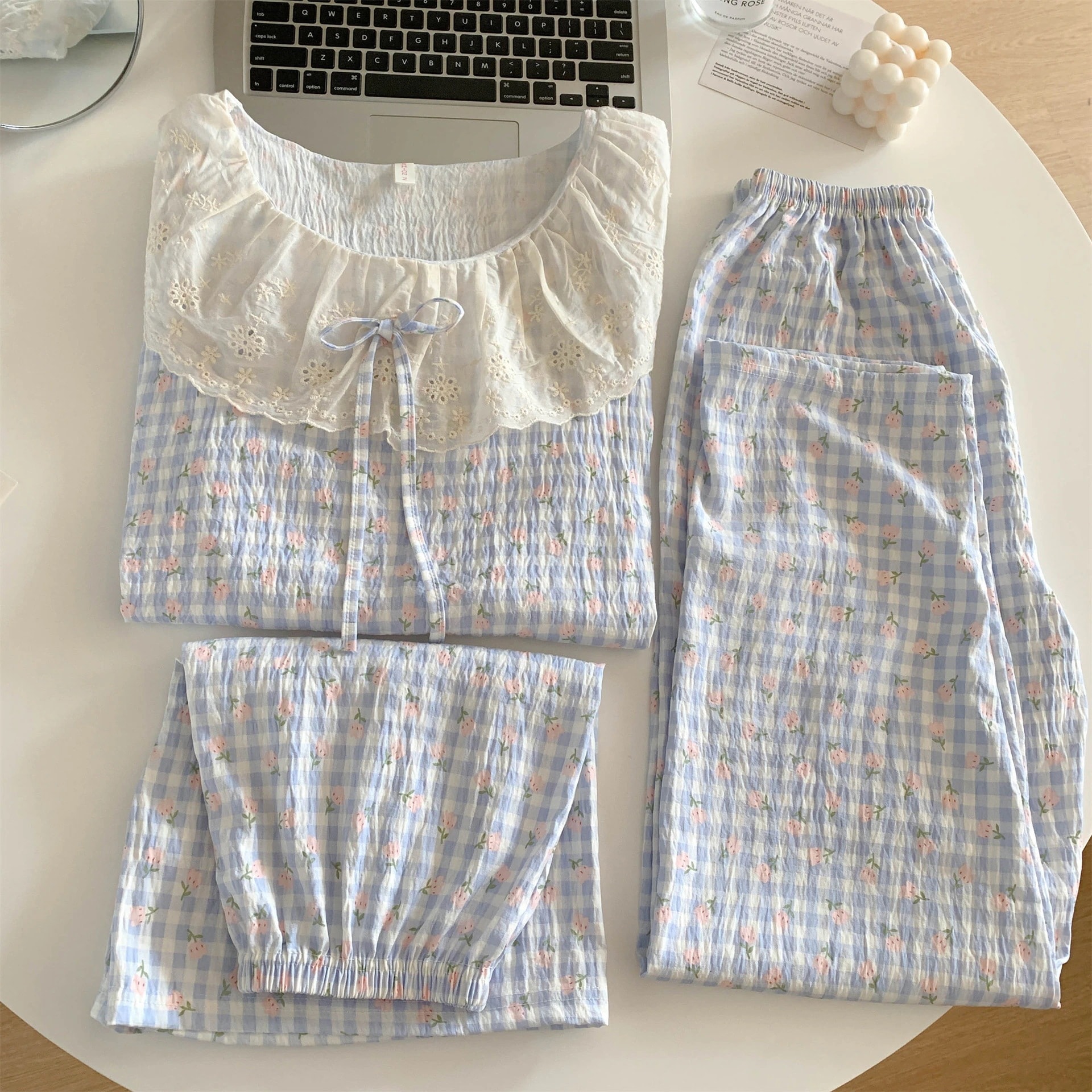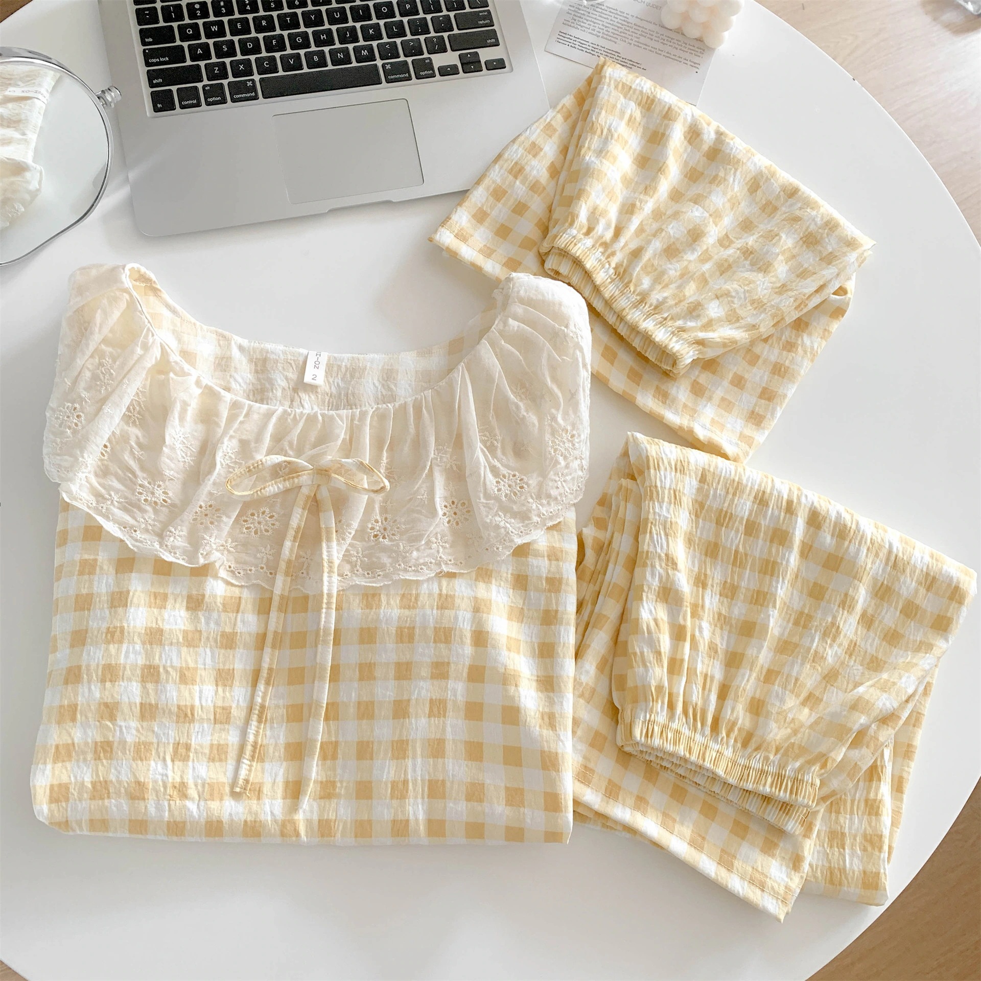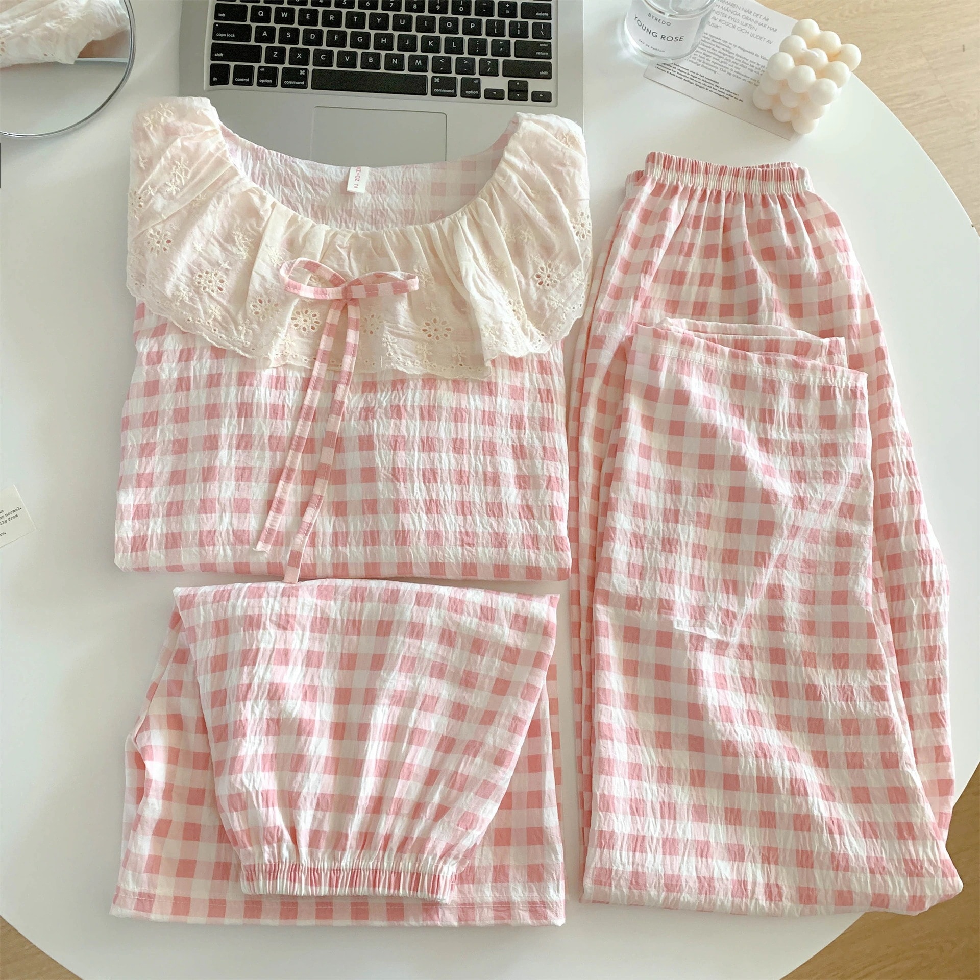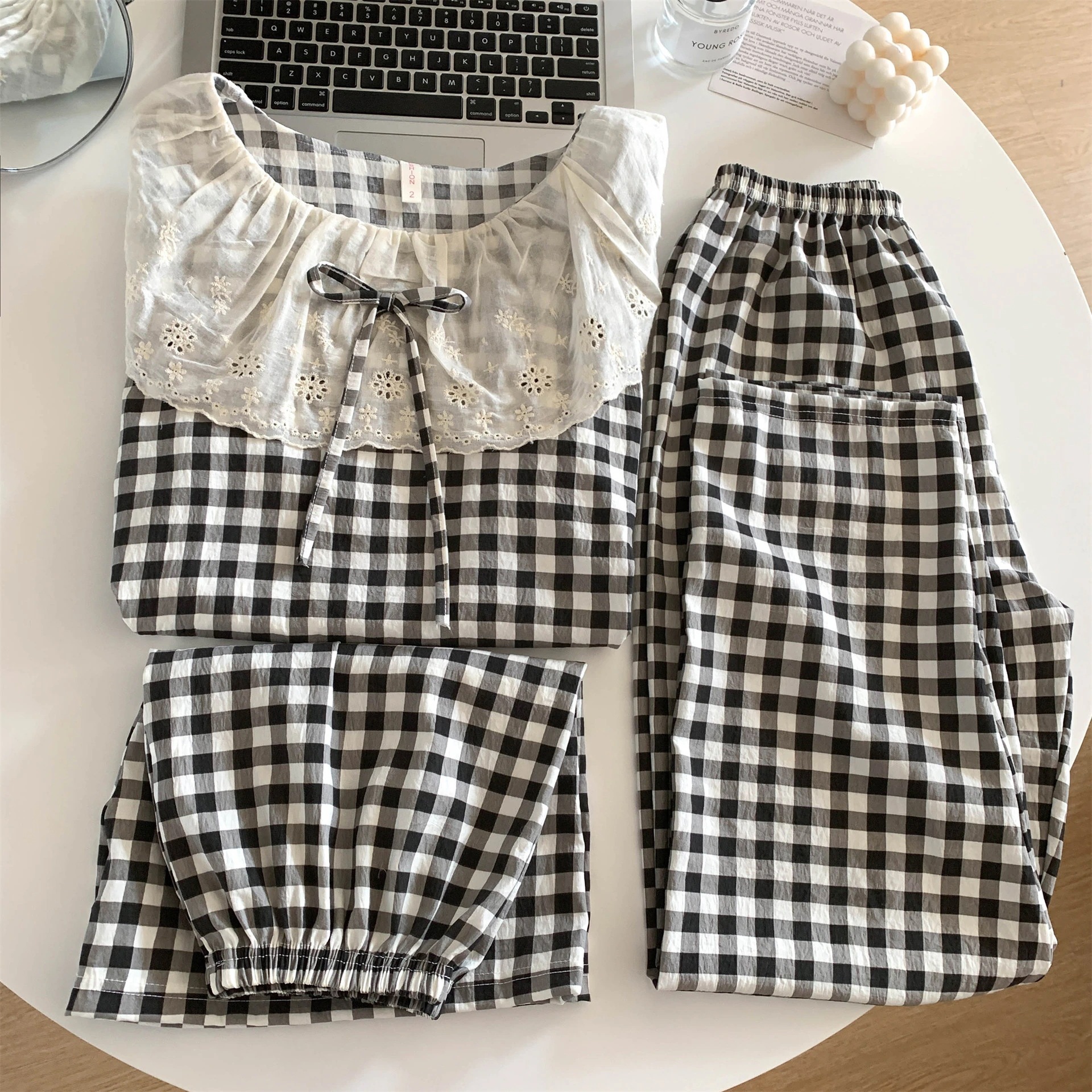 パジャマ女性夏女の子甘いレース格子縞半袖ショートパンツホームウェアセット