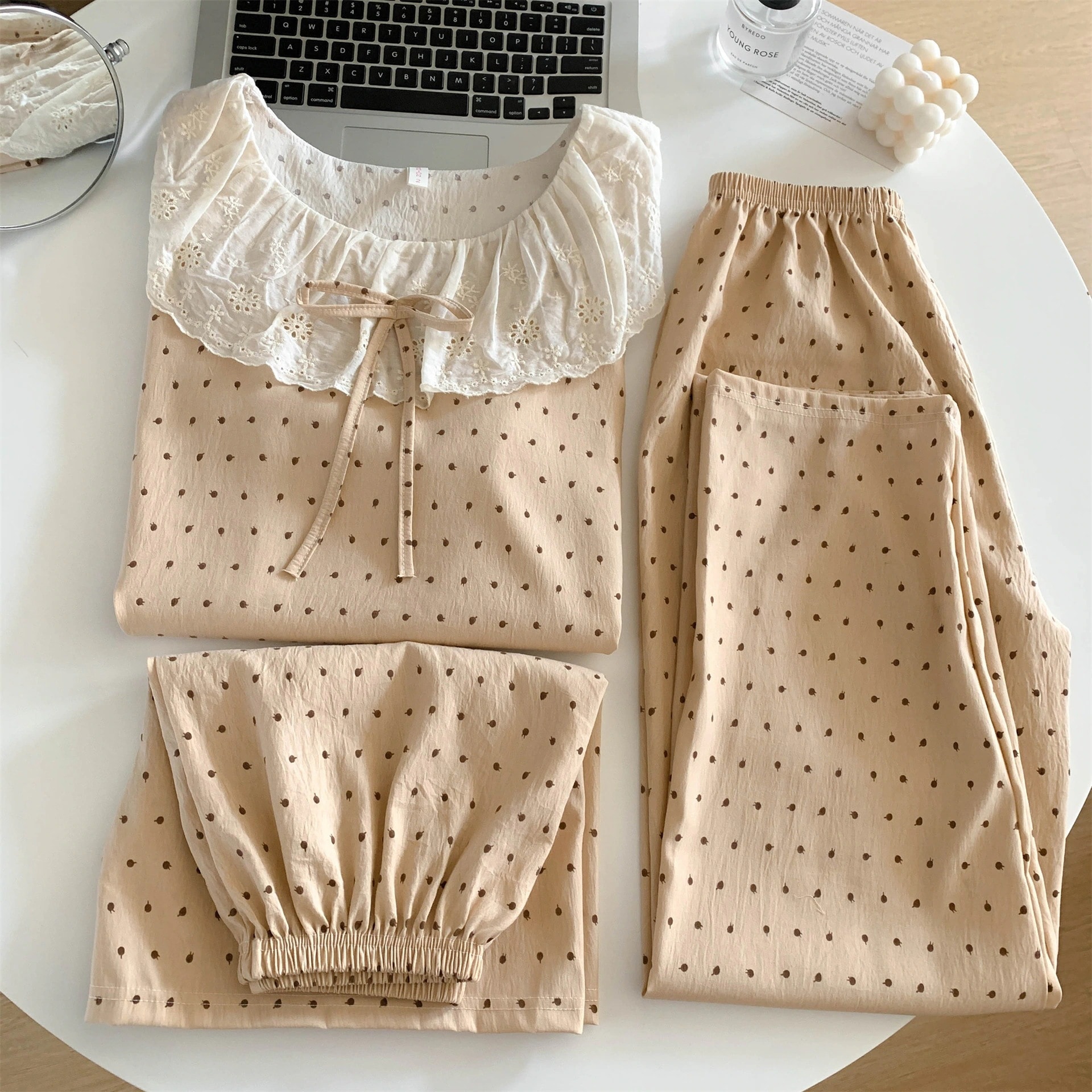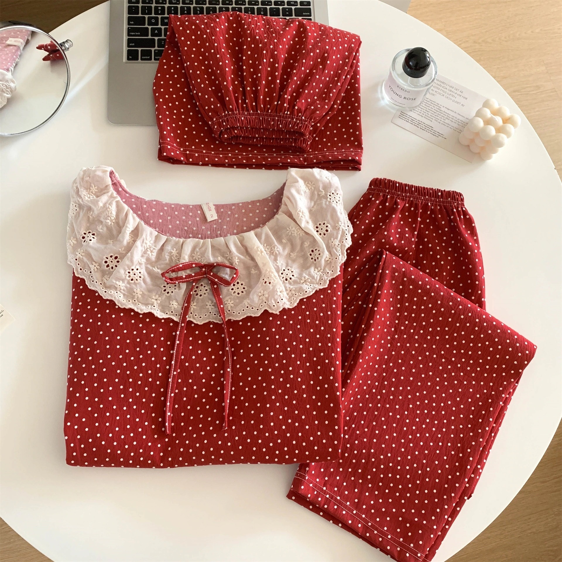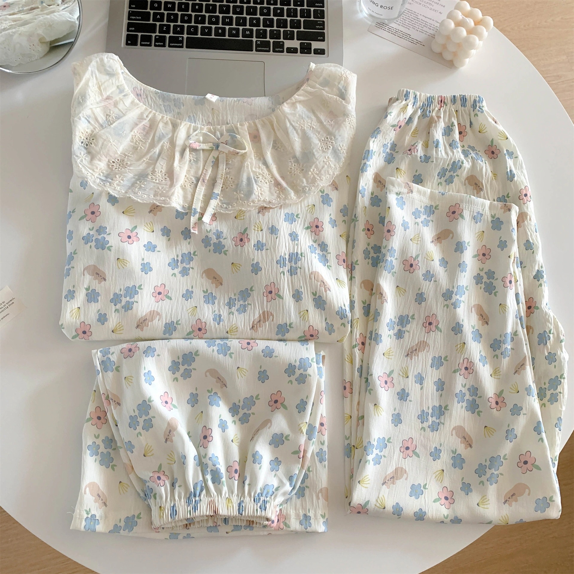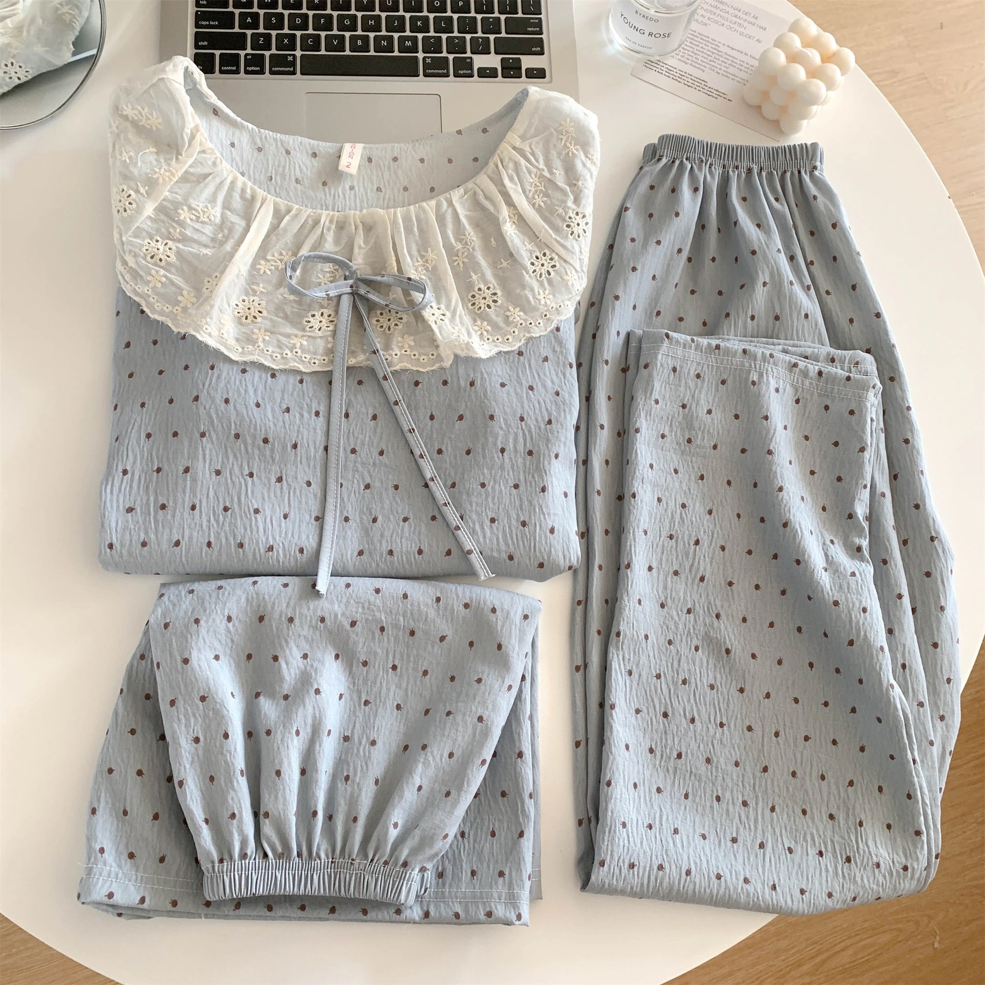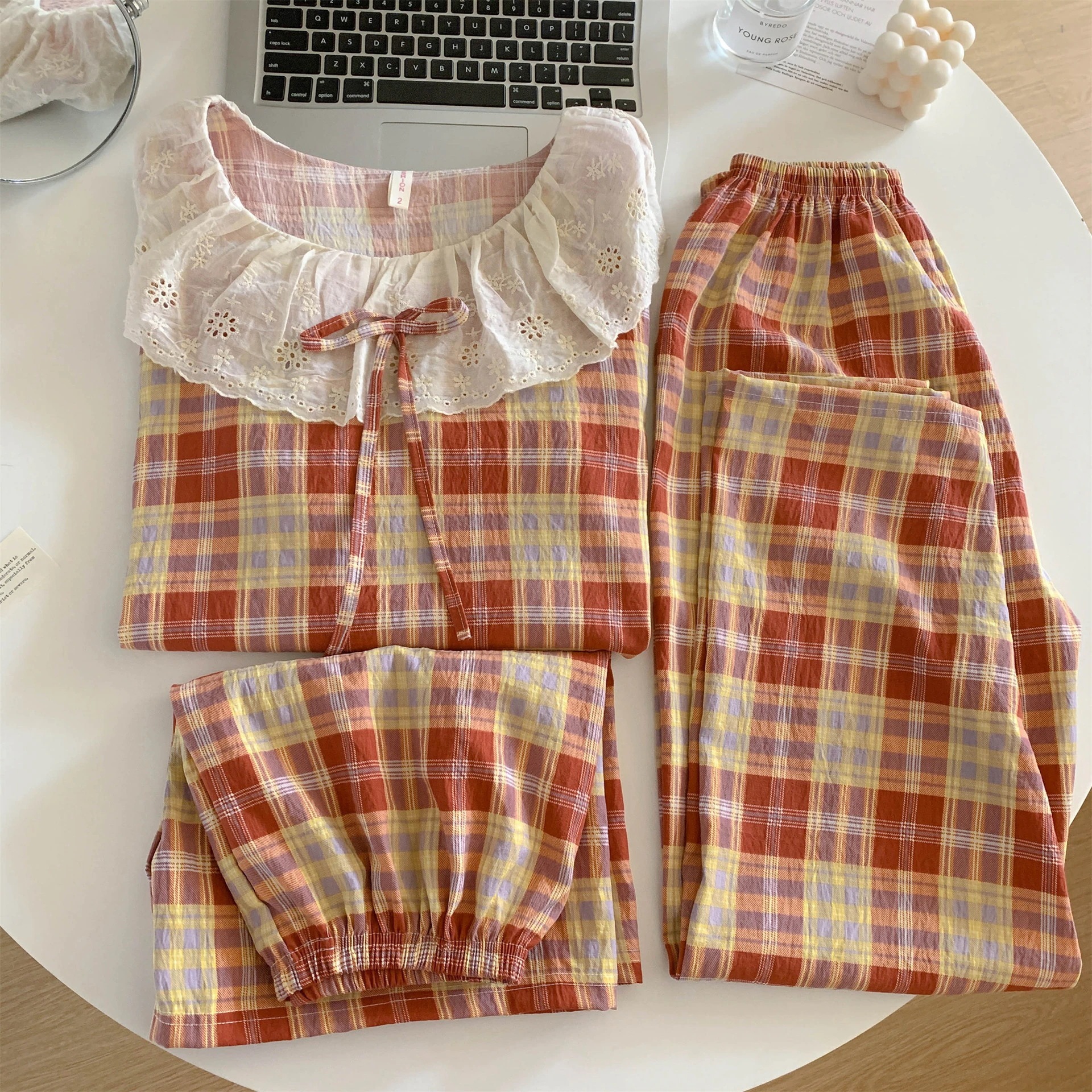 パジャマ女性夏女の子甘いレース格子縞半袖ショートパンツホームウェアセット