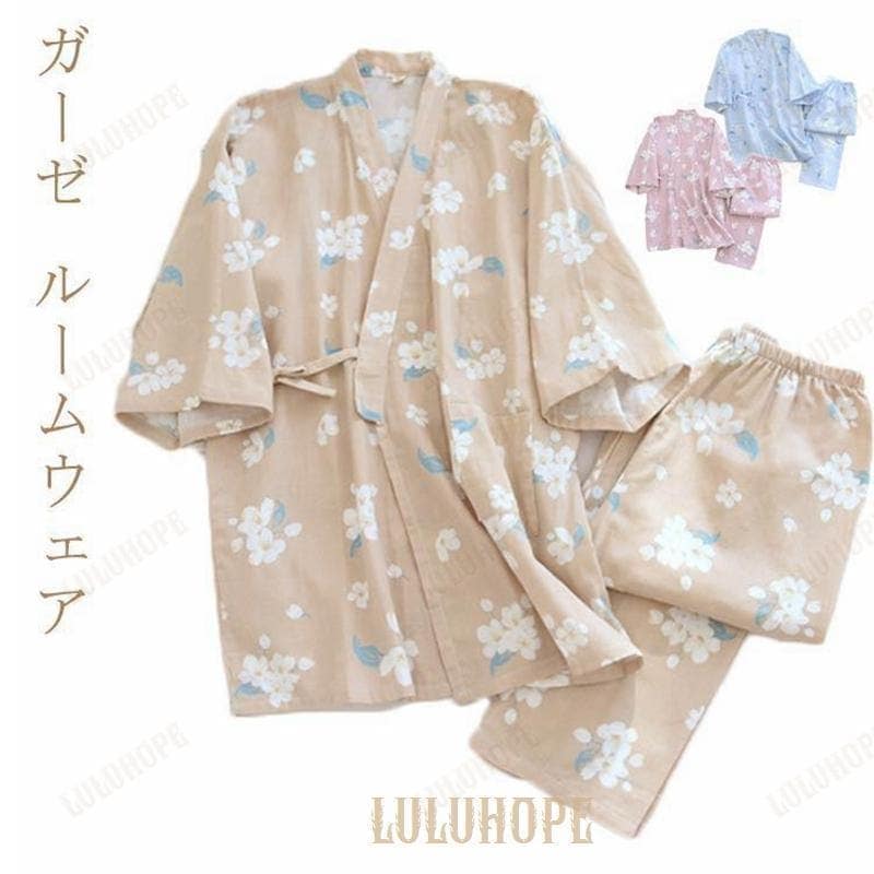 新作セール即納 ガーゼ レディース パジャマ 甚平 旅館 ウェア 和式 温泉 風呂 部屋着 ホテル ナイトウェア 七分袖 浴衣 可愛い 甚平 浴衣