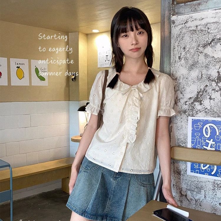新モデル発売 アートな雰囲気の綿刺繍ドールネックバンド半袖ブラウス女性の泡袖トップスTシャツ トップス  t